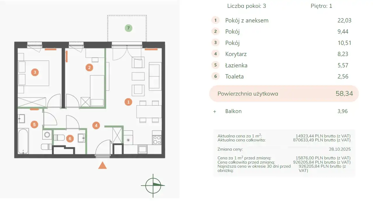 - Charakterystyka mieszkania 58.34 m2, 3 pokoje