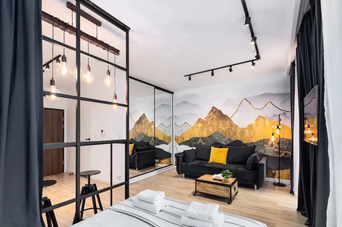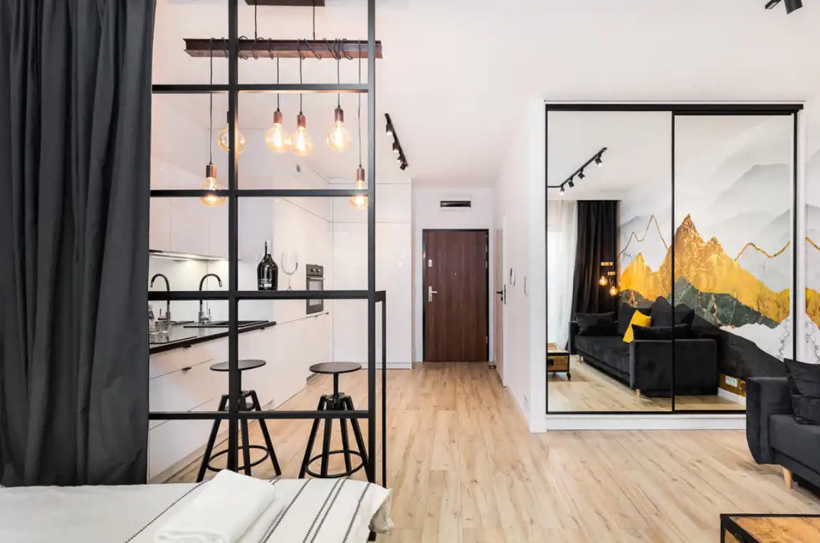 - Układ: sypialnia, salon z aneksem kuchennym wyposażonym w pełny zestaw RTV/AGD, łazienka z białym montażem, przedpokój