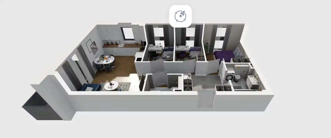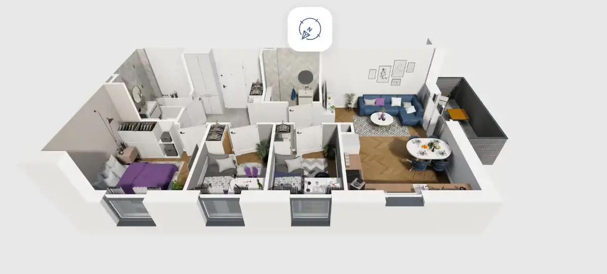Mieszkanie składające się z salonu z aneksem kuchennym, trzech sypialni, przedpokoju, łazienki, WC oraz balkonu