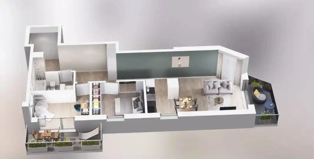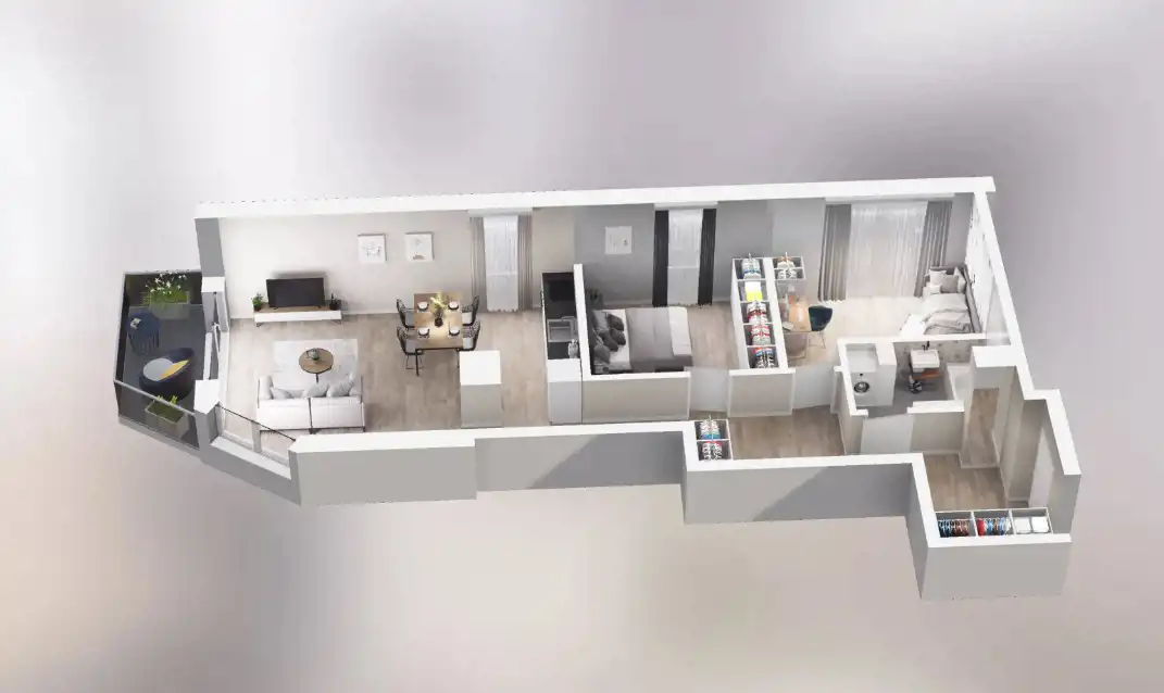 Mieszkanie składające się z salonu z aneksem kuchennym, dwóch sypialni, przedpokoju, łazienki oraz dwóch balkonów