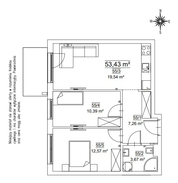 - Charakterystyka mieszkania 53.43 m2, 3 pokoje