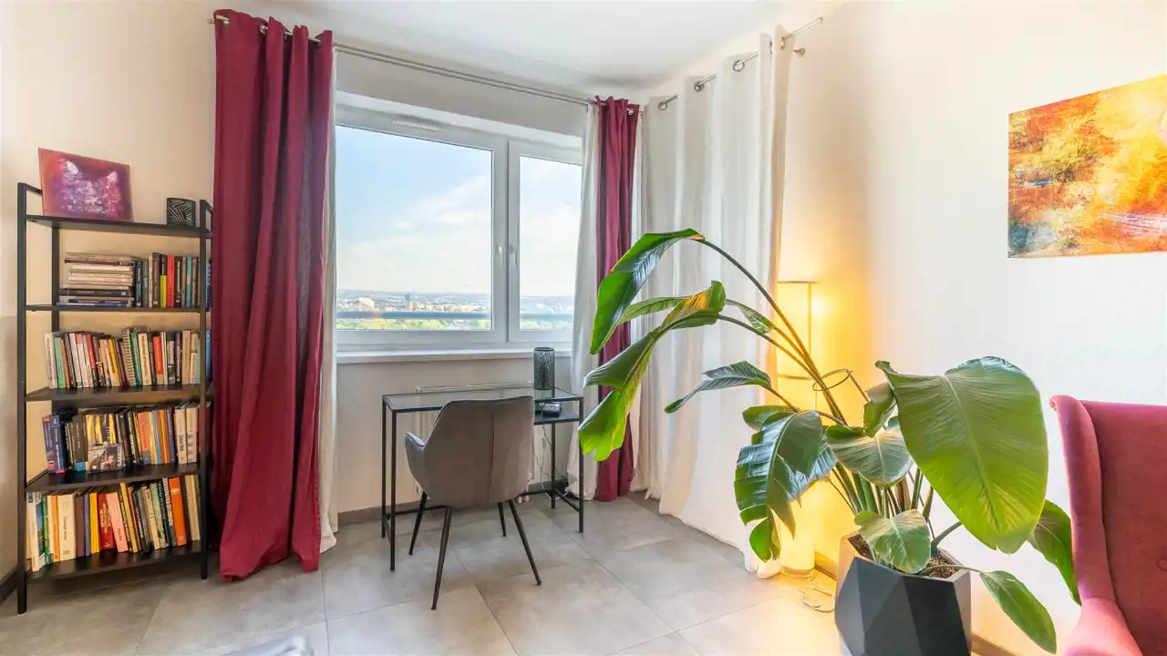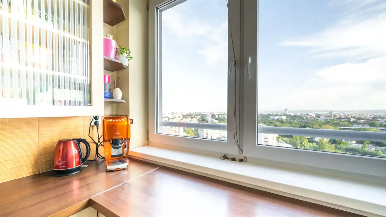 Dodatkowym atutem jest przeszklona loggia o powierzchni 3 m², z której roztacza się wyjątkowy widok na panoramę Krakowa, dzięki ekspozycji południowo-wschodniej.