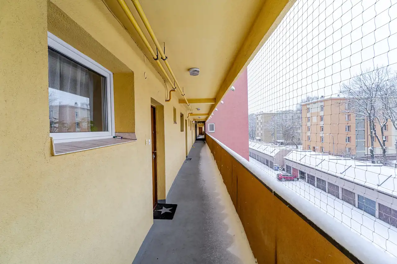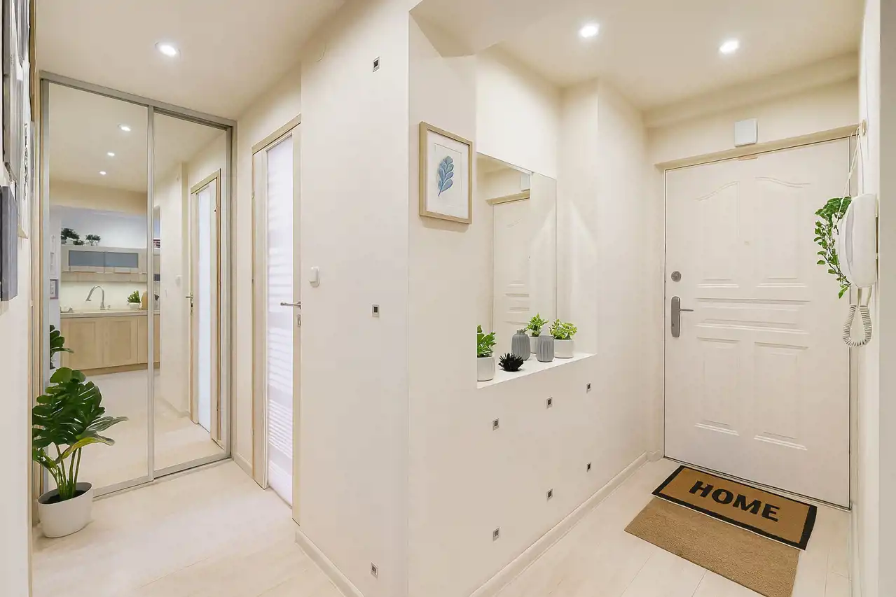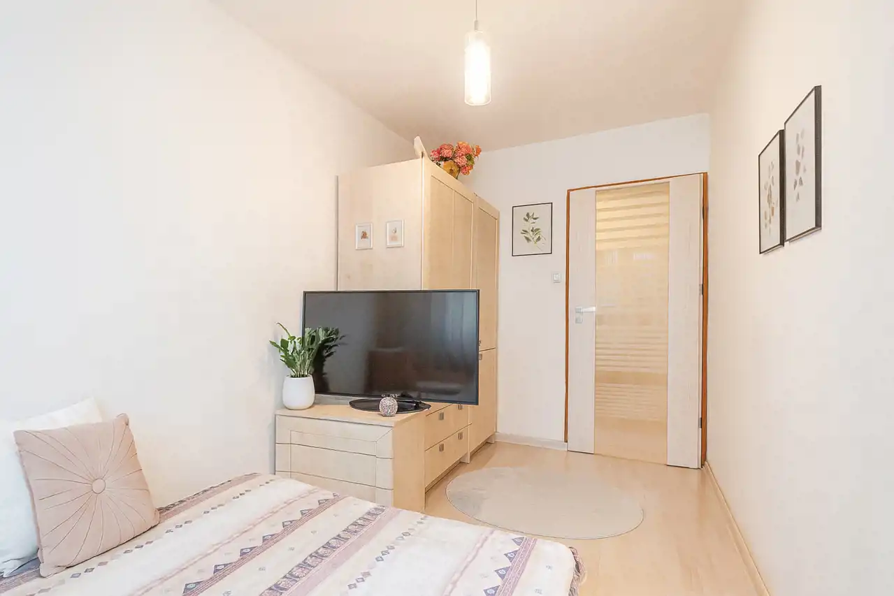 Wnętrze jest ciche, przytulne i bardzo wygodne w codziennym użytkowaniu. Ciekawym elementem jest oryginalne wejście do mieszkania – z korytarza prowadzącego przez otwartą przestrzeń, dającą wrażenie przejścia niczym z balkonu lub galerii. Południowa ekspozycja okien zapewnia doskonałe doświetlenie wnętrza i przyjemne, naturalne światło przez cały dzień.