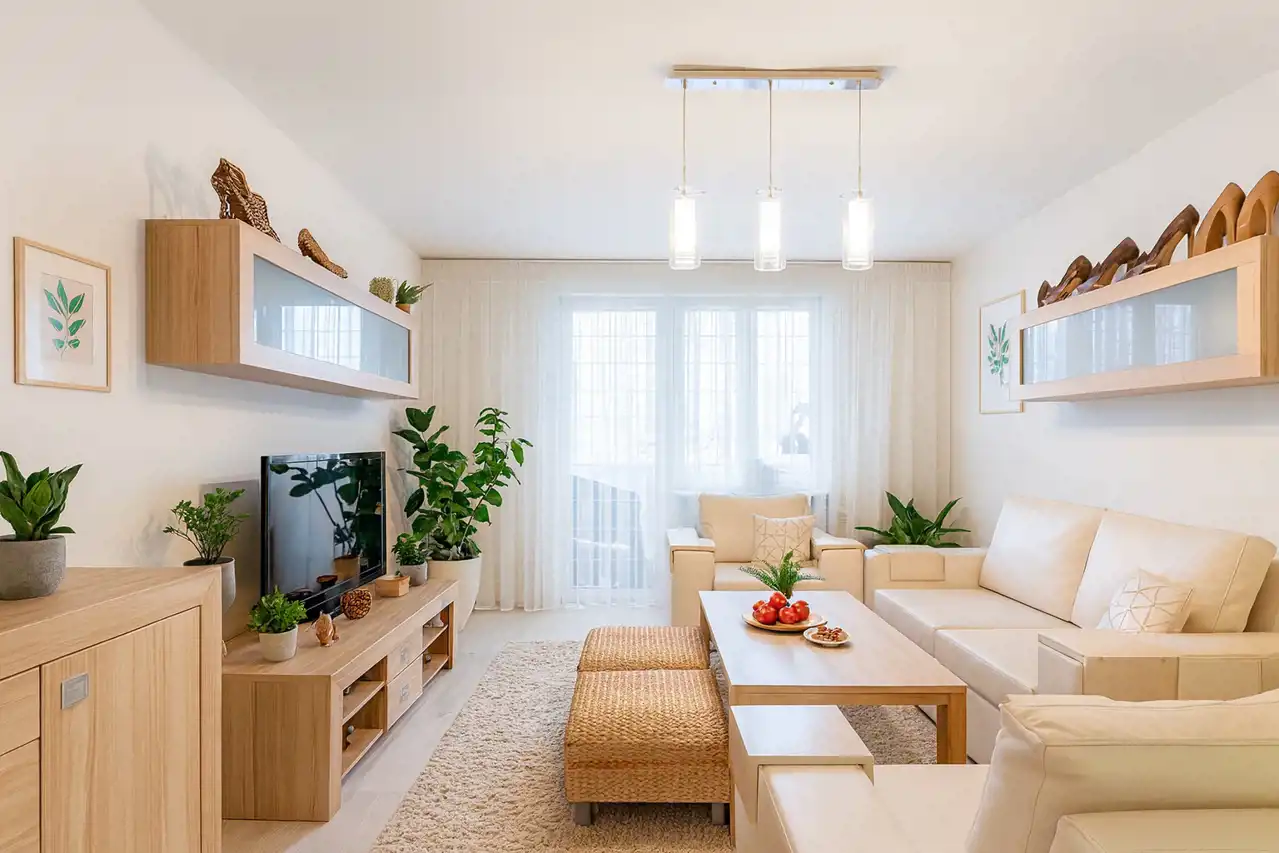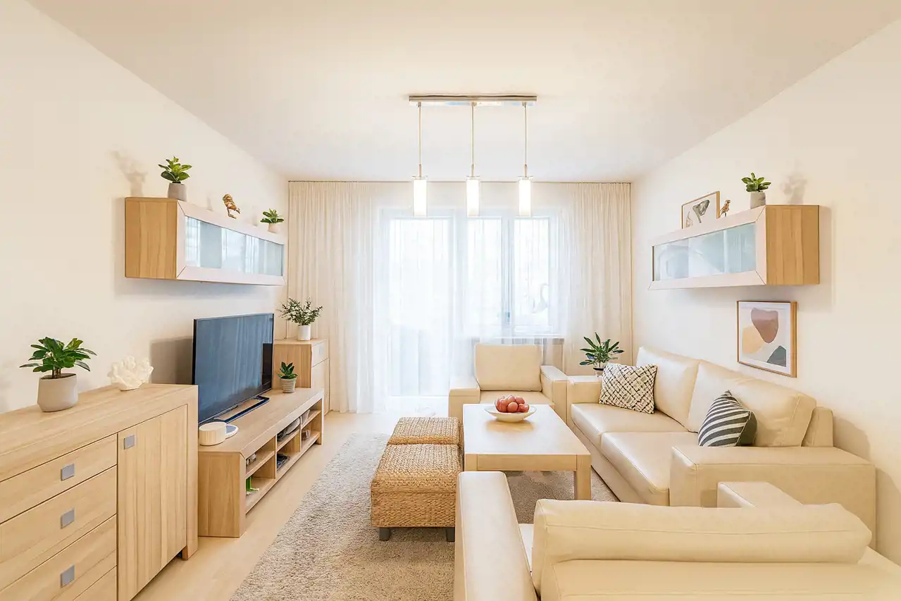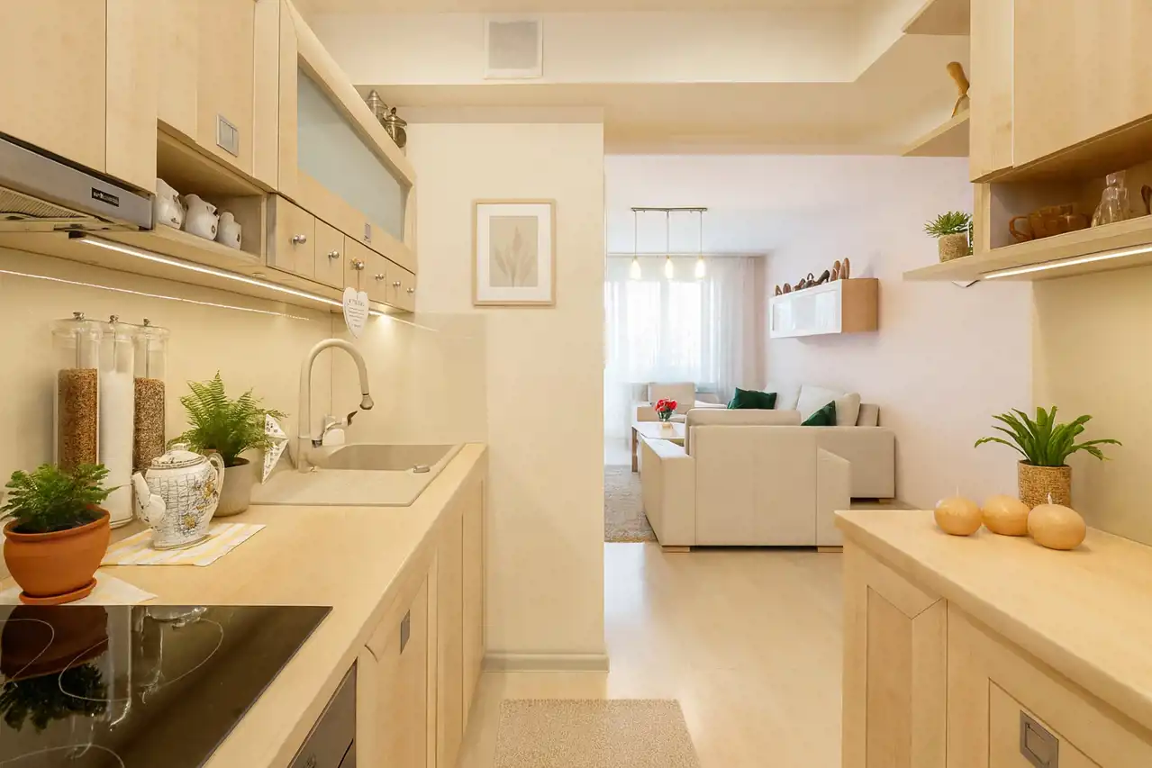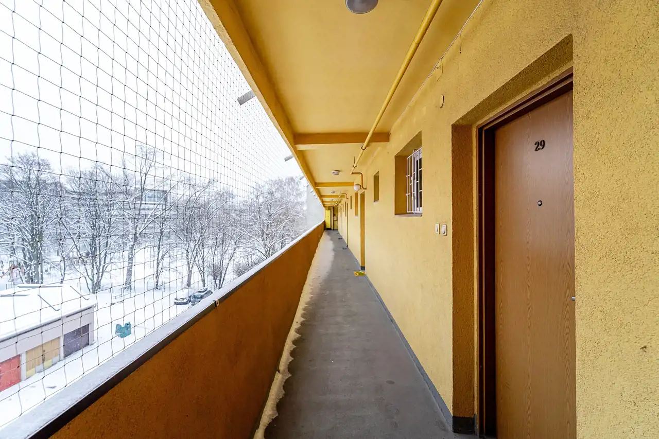 Wnętrze jest ciche, przytulne i bardzo wygodne w codziennym użytkowaniu. Ciekawym elementem jest oryginalne wejście do mieszkania – z korytarza prowadzącego przez otwartą przestrzeń, dającą wrażenie przejścia niczym z balkonu lub galerii. Południowa ekspozycja okien zapewnia doskonałe doświetlenie wnętrza i przyjemne, naturalne światło przez cały dzień.