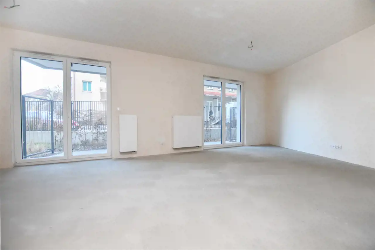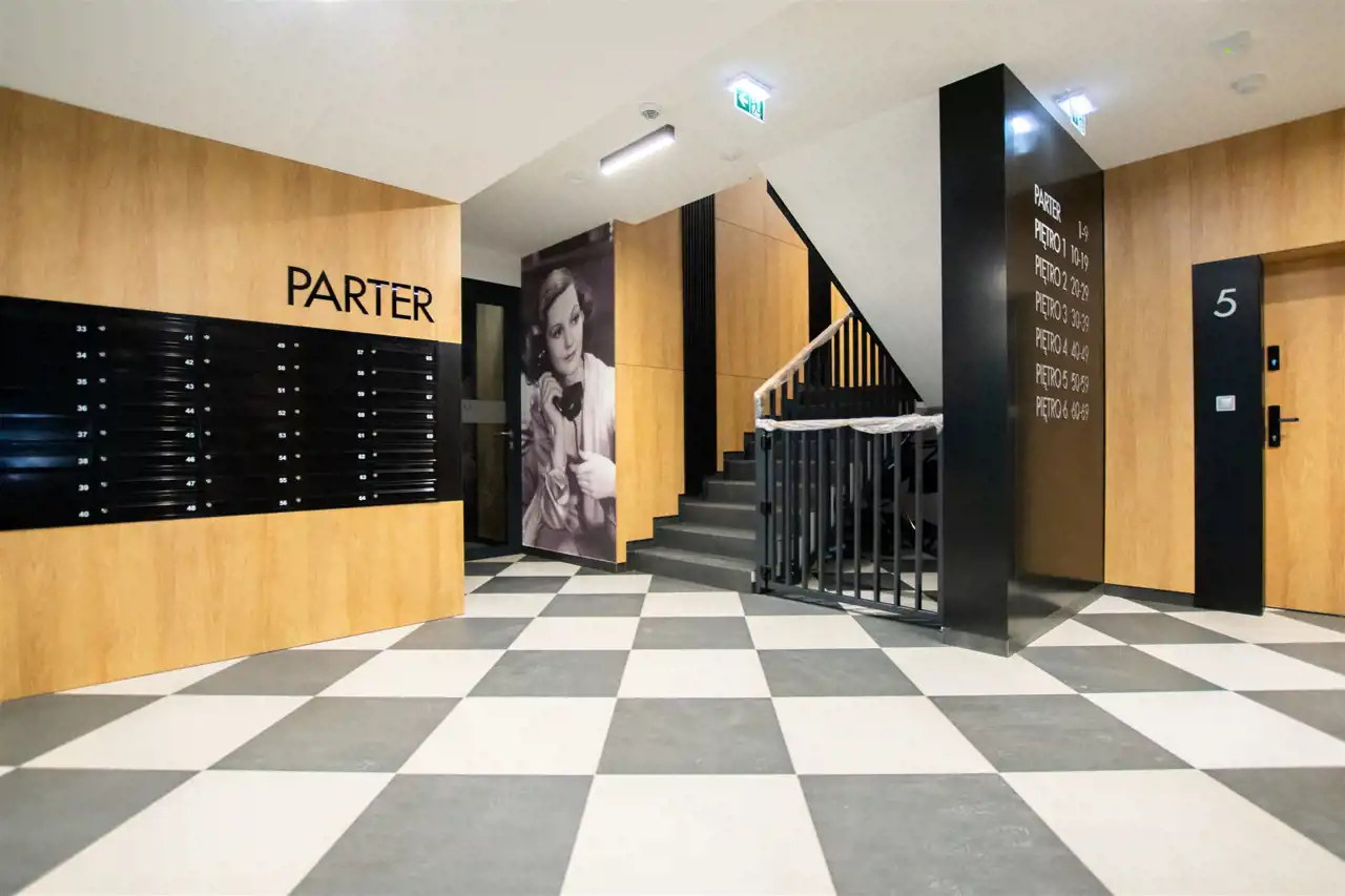 Mieszkanie znajduje się na parterze nowoczesnego budynku i charakteryzuje się dużymi przeszkleniami, które zapewniają doskonałe doświetlenie wnętrz oraz poczucie przestrzeni.