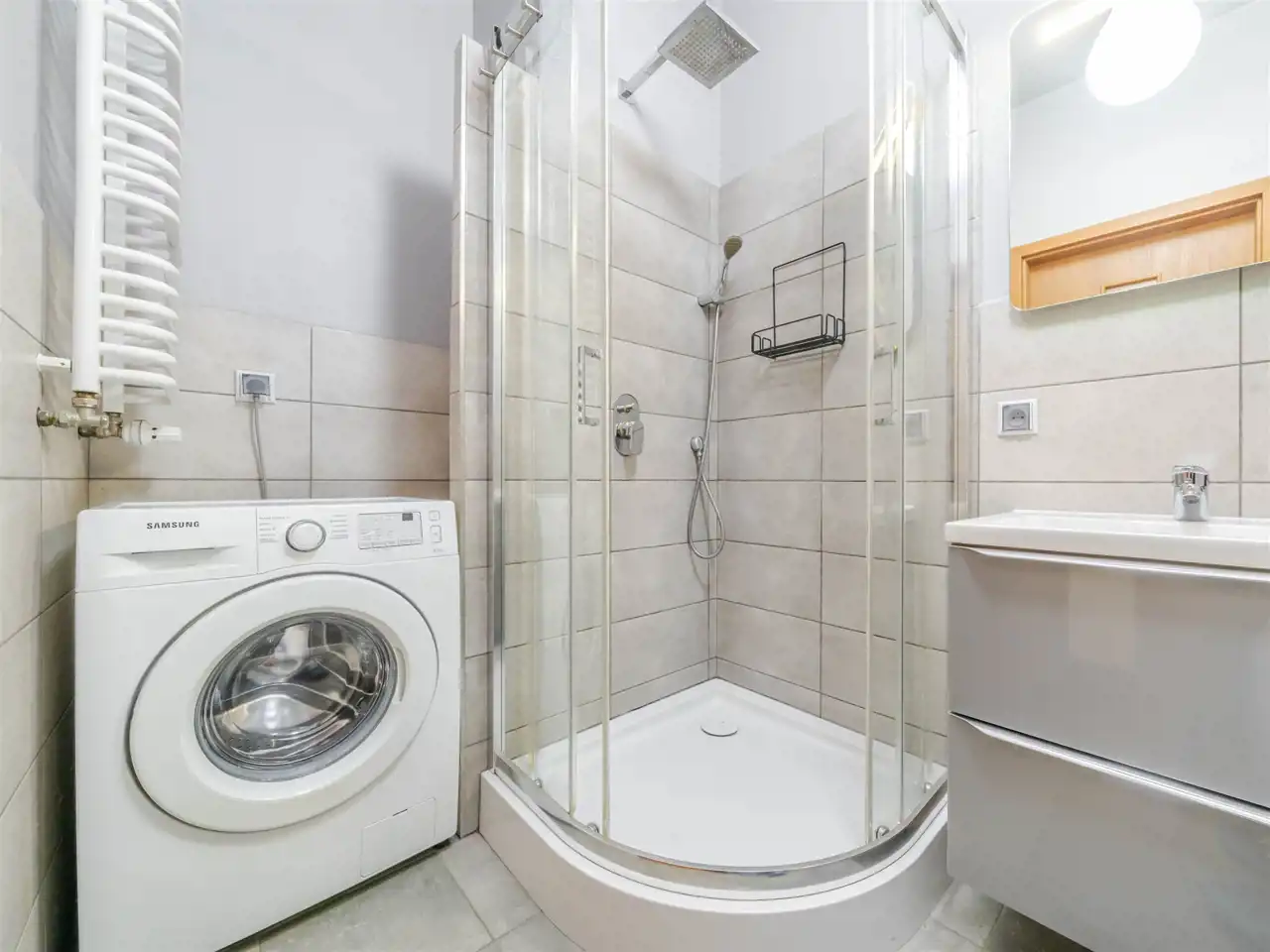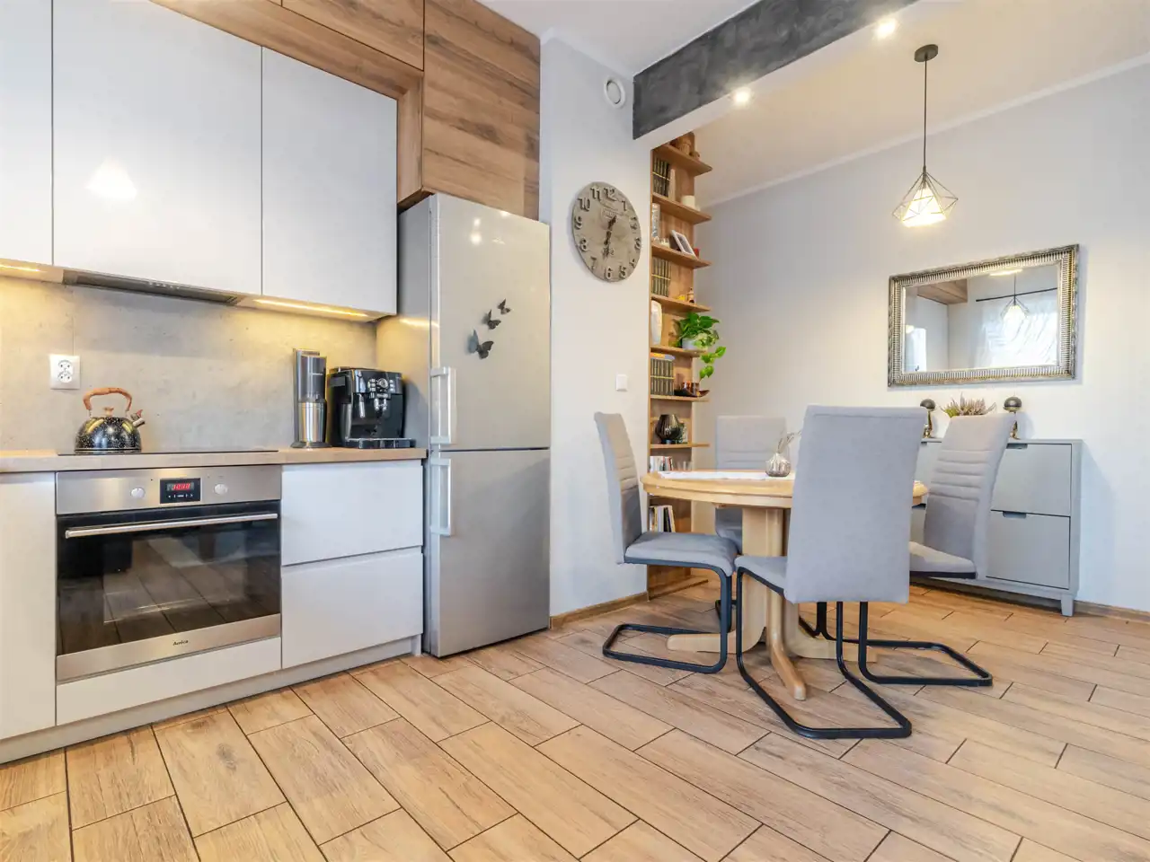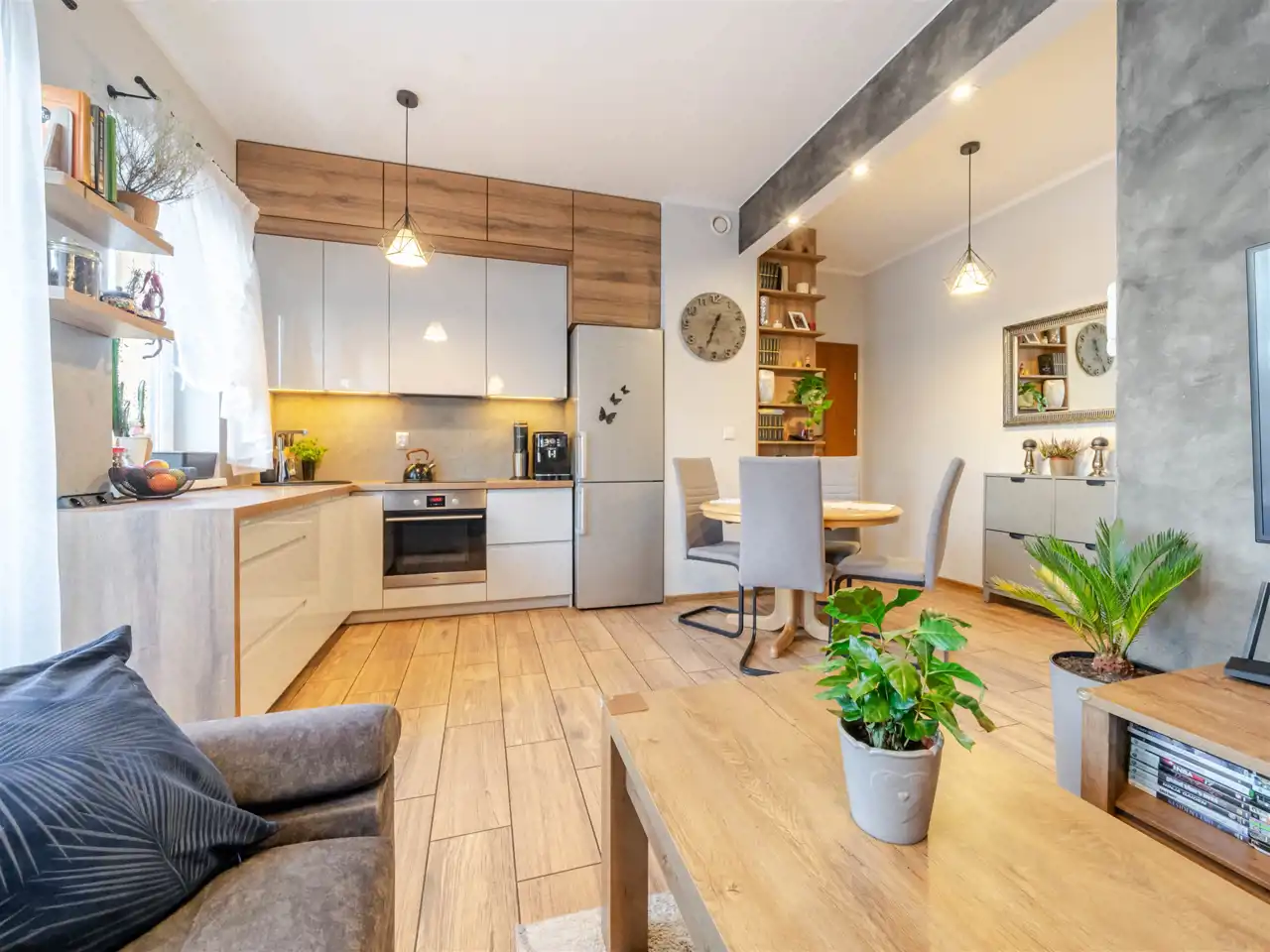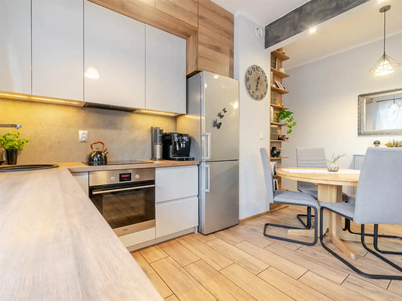 Kuchnia jest wyposażona w sprzęt AGD – zmywarkę, lodówko‑zamrażarkę, piekarnik oraz płytę indukcyjną. Szafy wykonano na wymiar przez stolarza, a w łazience zastosowano elegancką ceramikę i armaturę. Ogrzewanie i ciepła woda pochodzą z sieci miejskiej MPEC.
