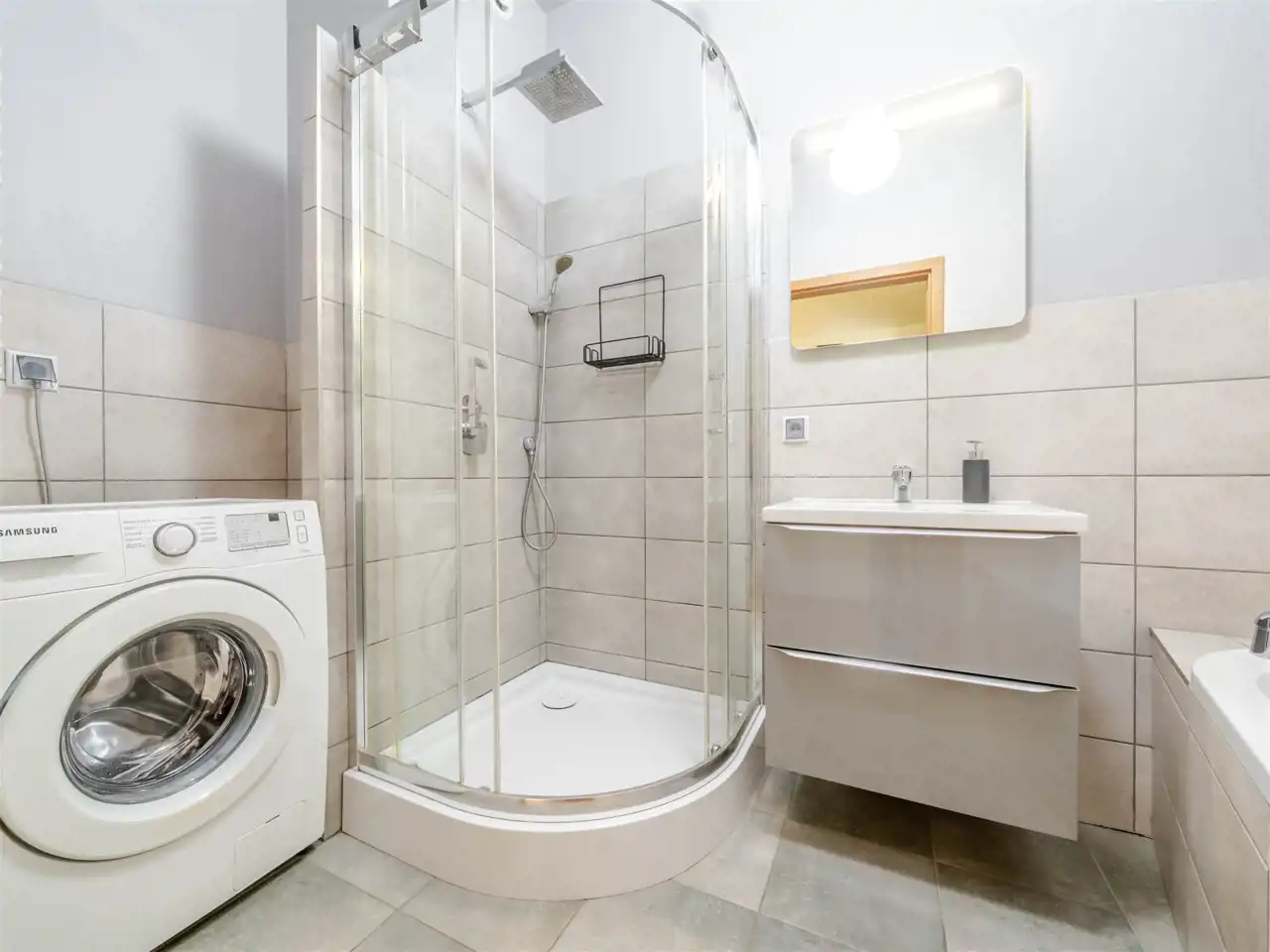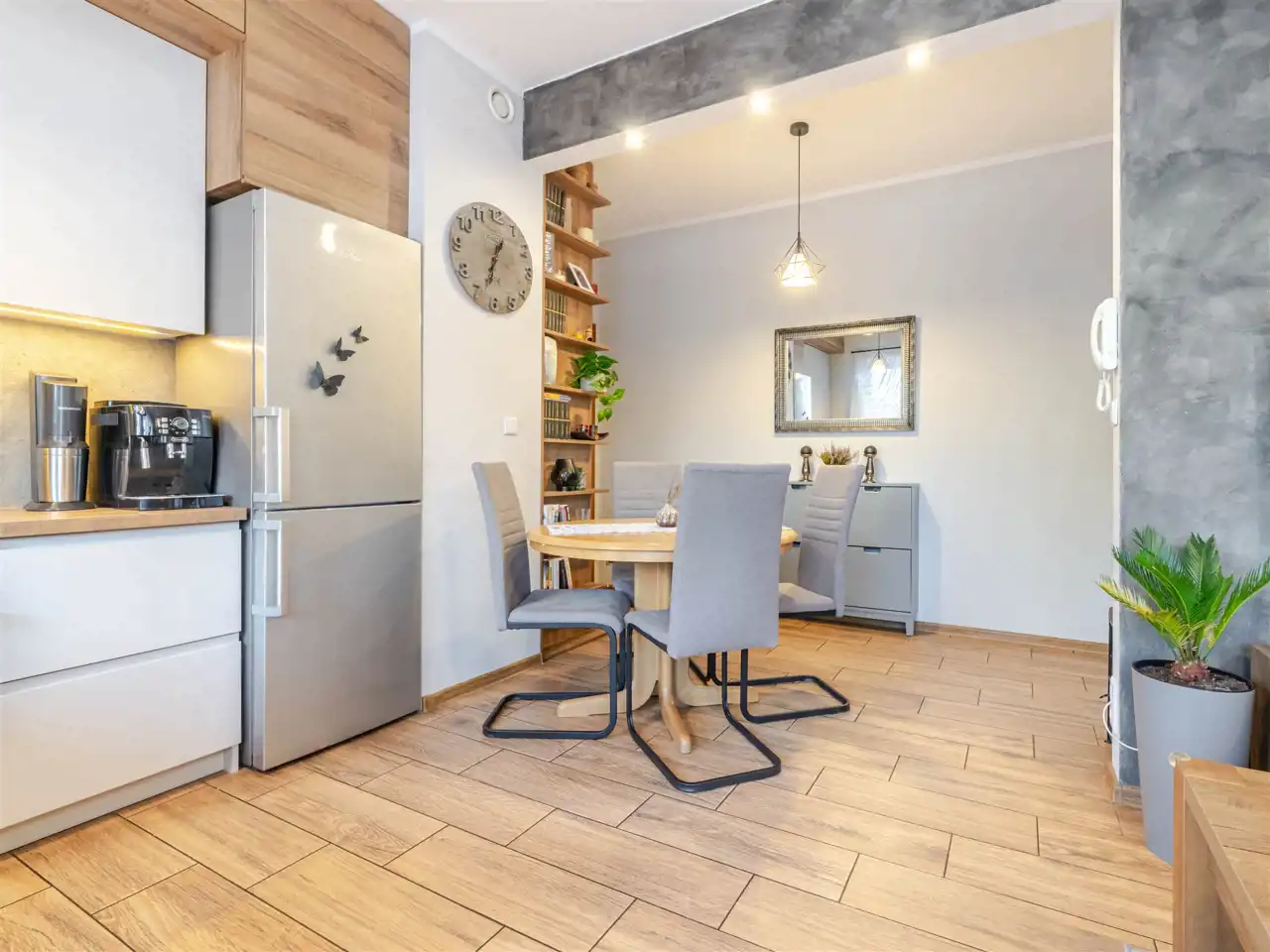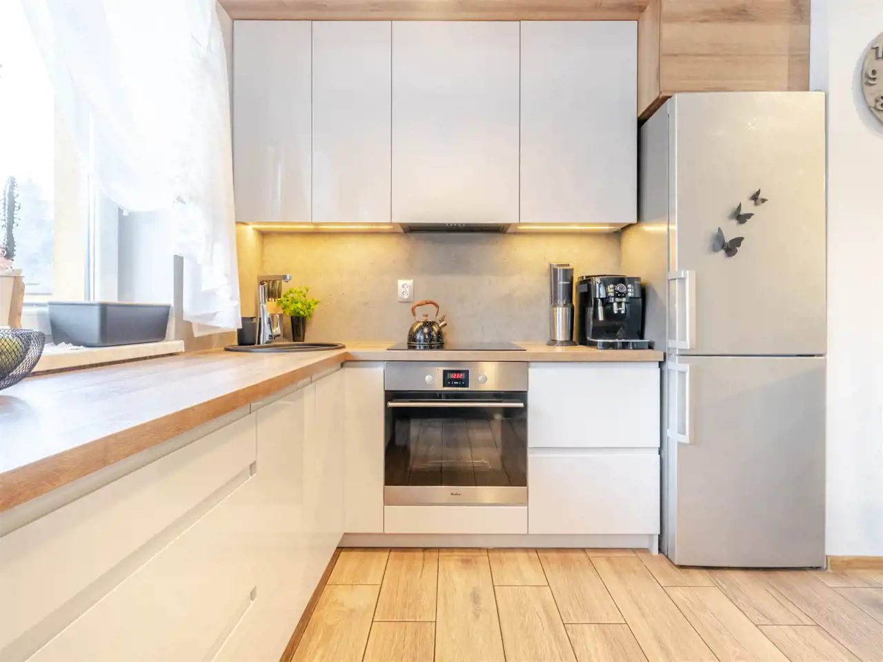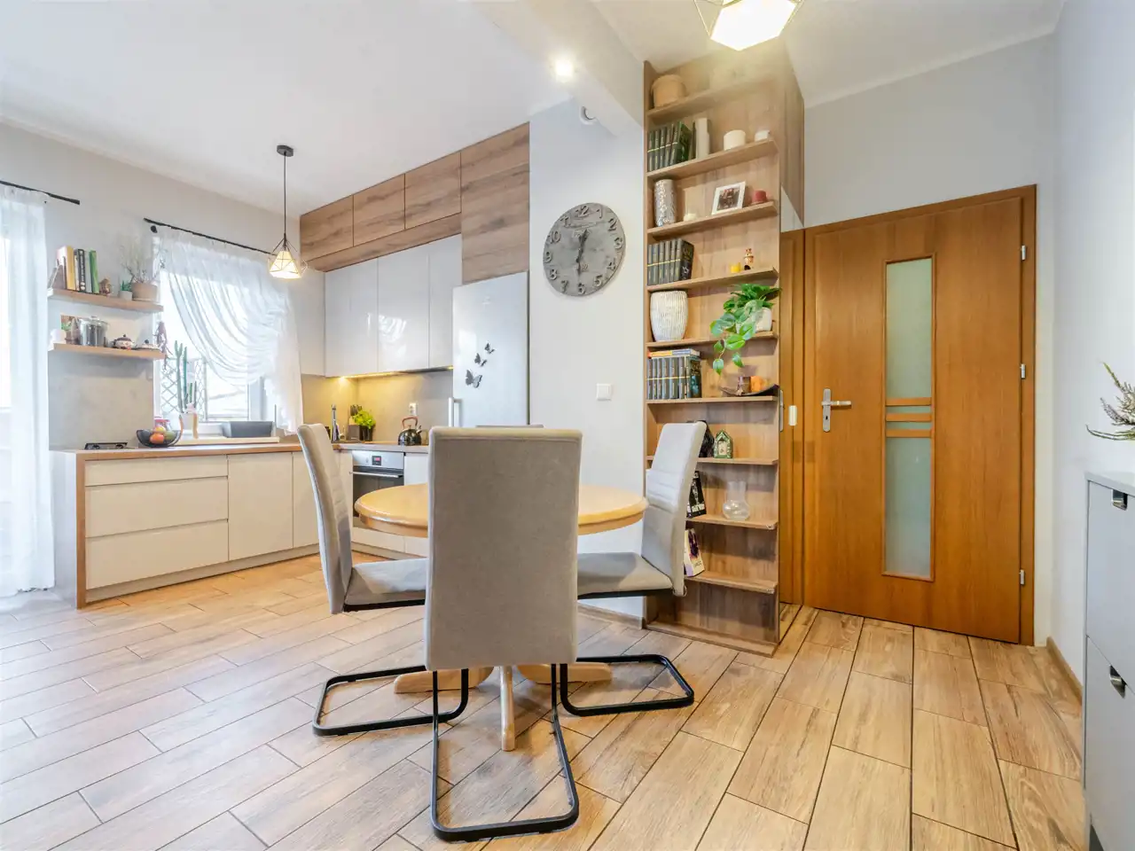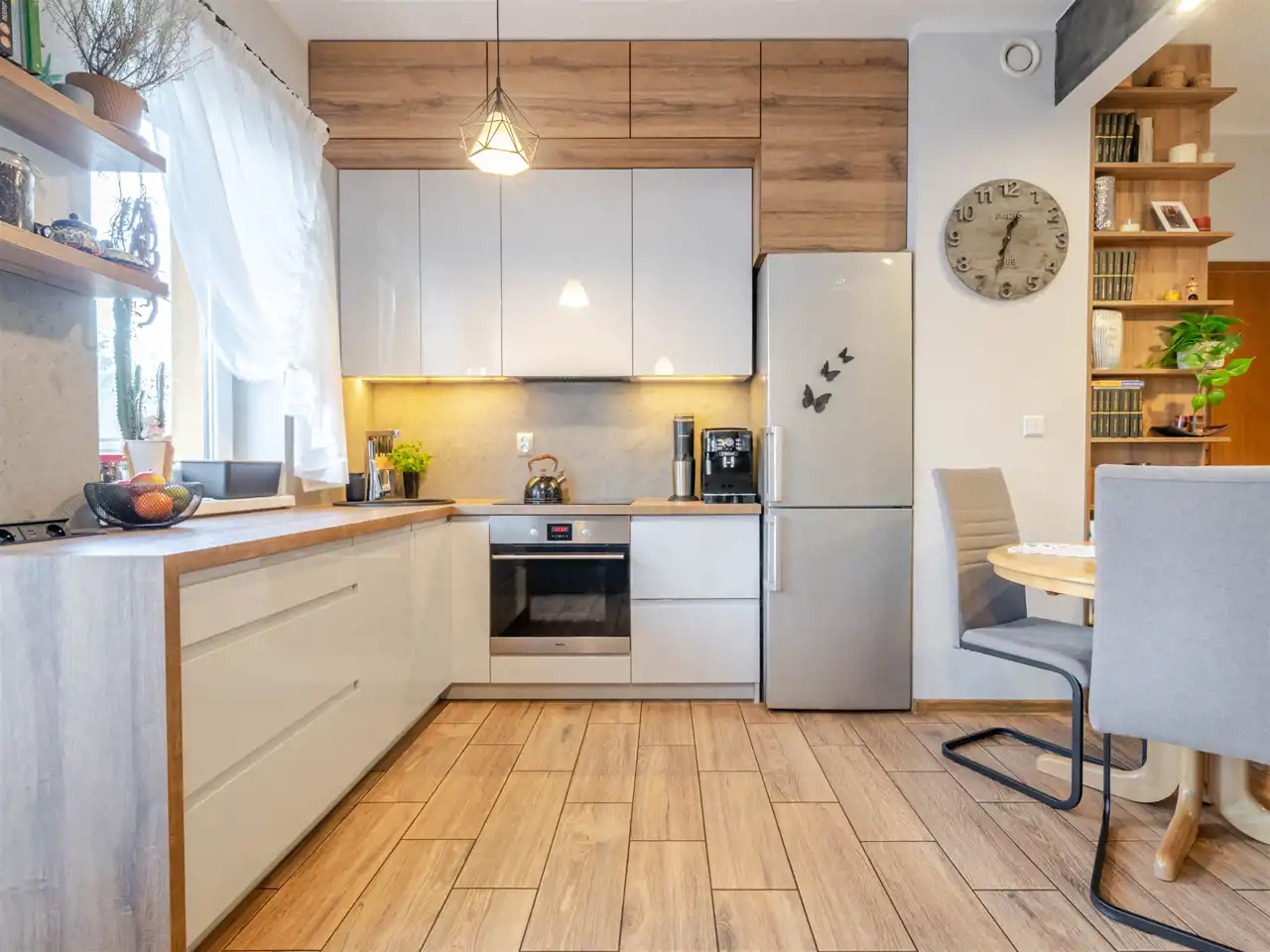 Kuchnia jest wyposażona w sprzęt AGD – zmywarkę, lodówko‑zamrażarkę, piekarnik oraz płytę indukcyjną. Szafy wykonano na wymiar przez stolarza, a w łazience zastosowano elegancką ceramikę i armaturę. Ogrzewanie i ciepła woda pochodzą z sieci miejskiej MPEC.