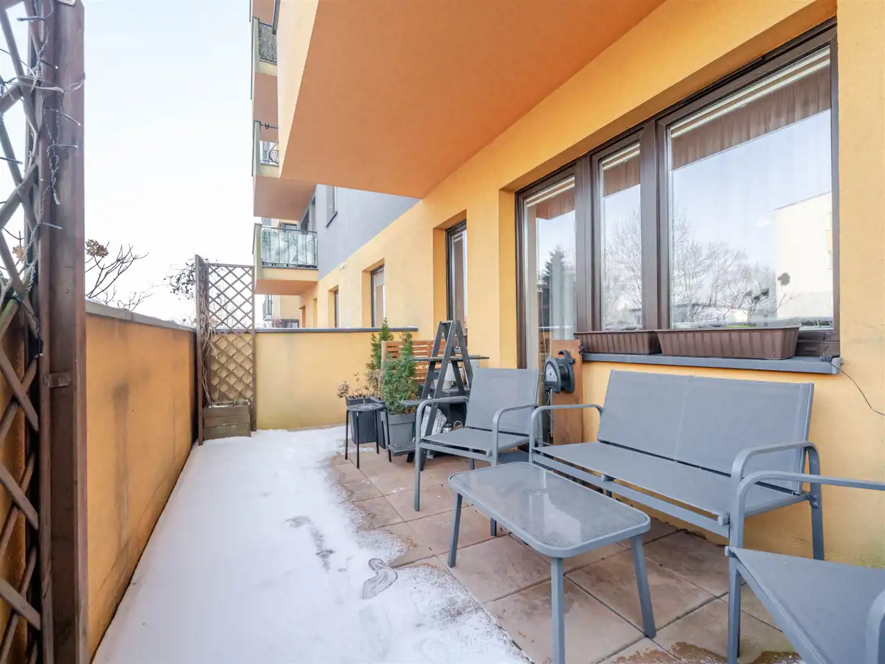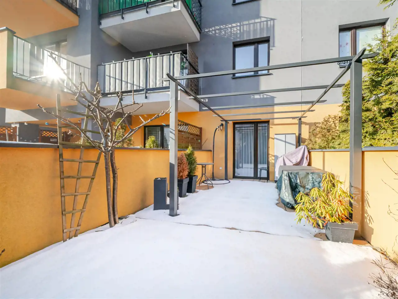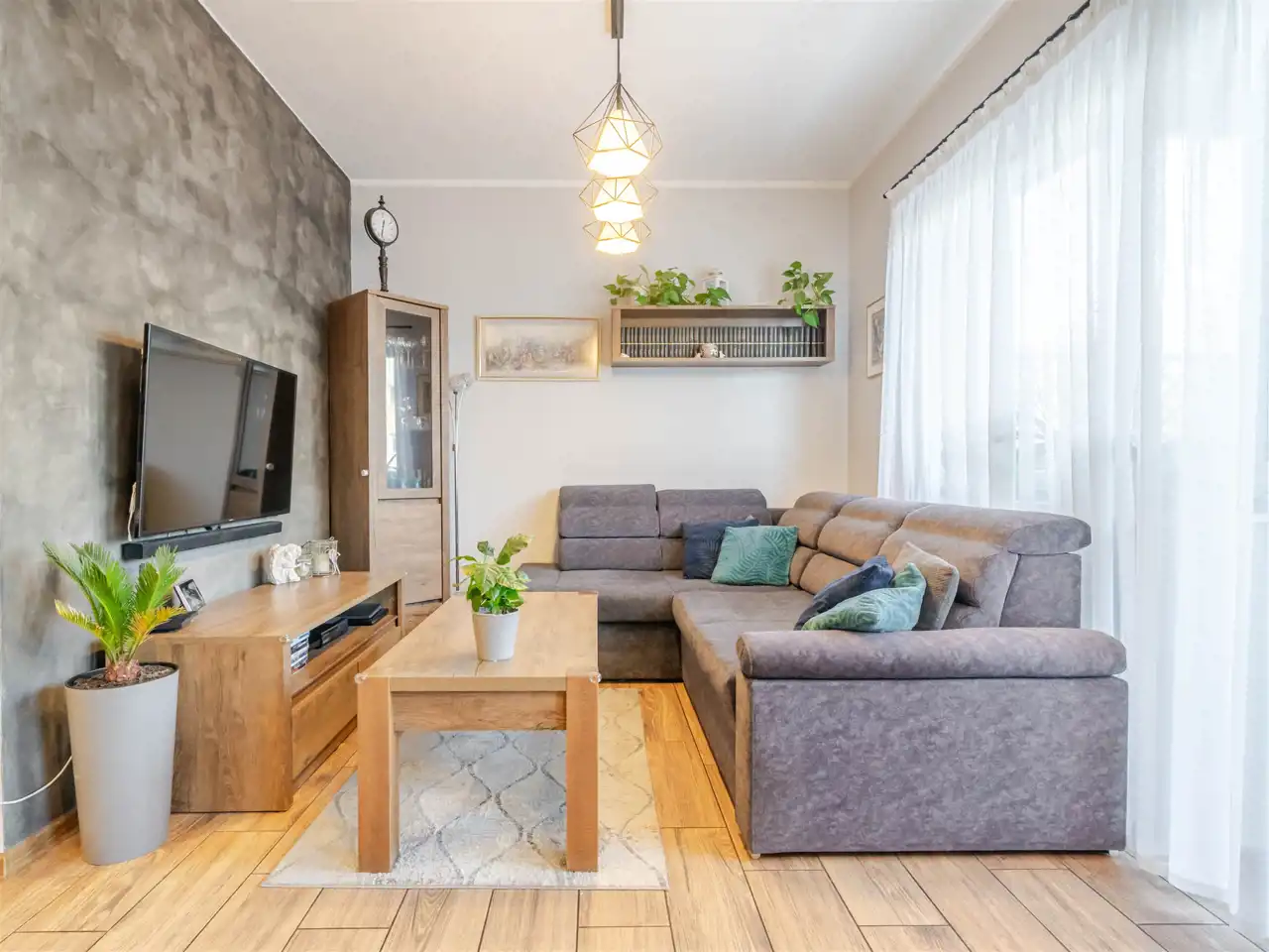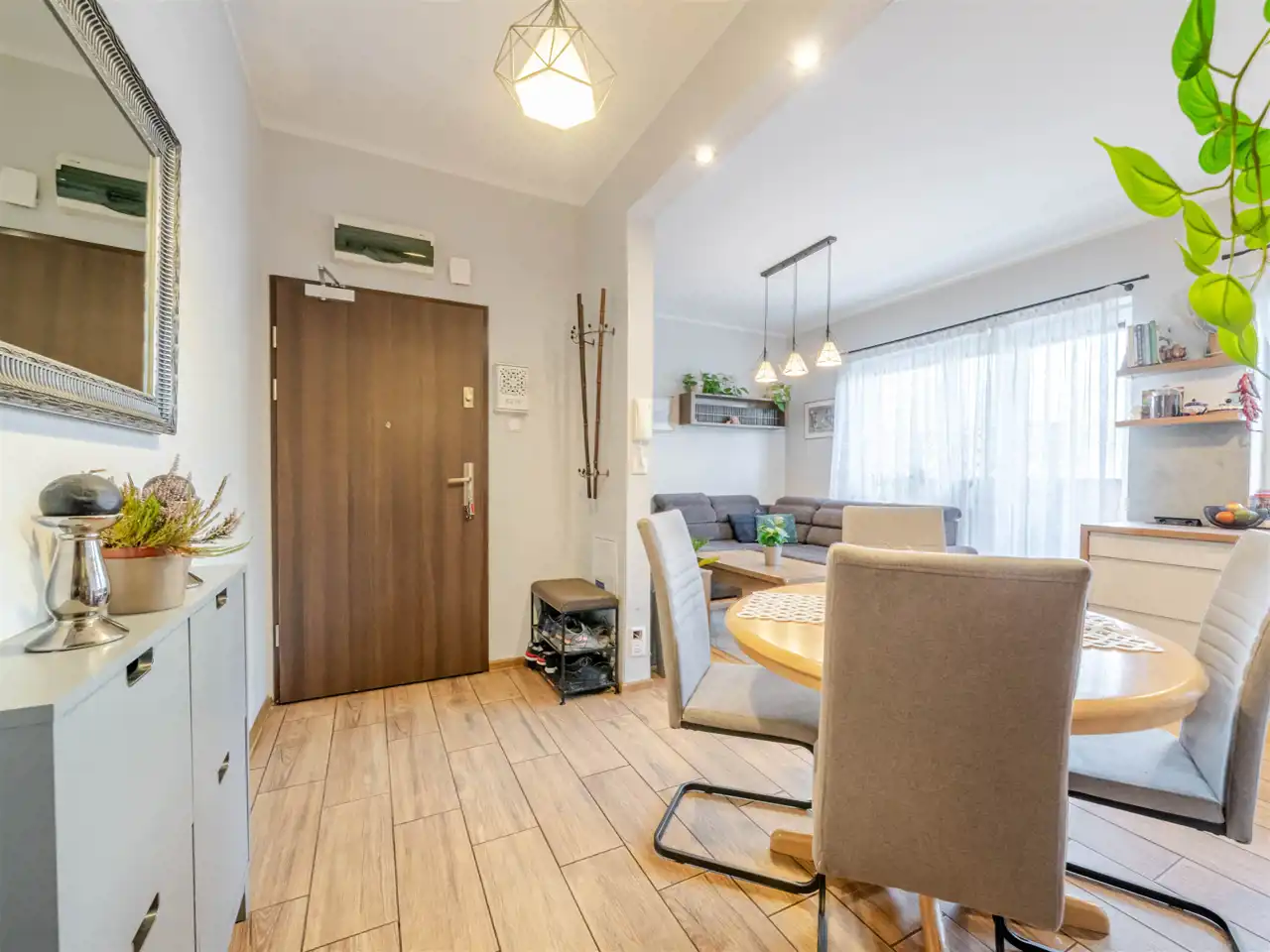 Mieszkanie jest dwustronne i posiada dwa duże tarasy – jeden o powierzchni 13,7 m², drugi 25,3 m², które stanowią doskonałe miejsce do wypoczynku na świeżym powietrzu. W skład mieszkania wchodzą salon z aneksem kuchennym, dwie sypialnie, garderoba, łazienka, WC oraz przedpokój z zabudową. Wnętrze zostało wykończone w wysokim standardzie z dbałością o jakość i funkcjonalność.