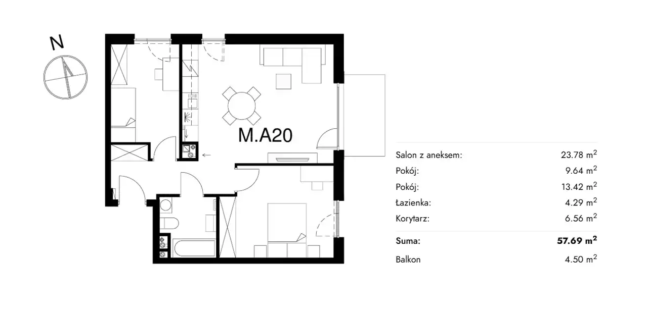 • Charakterystyka mieszkania 57.69 m2, 3 pokoje