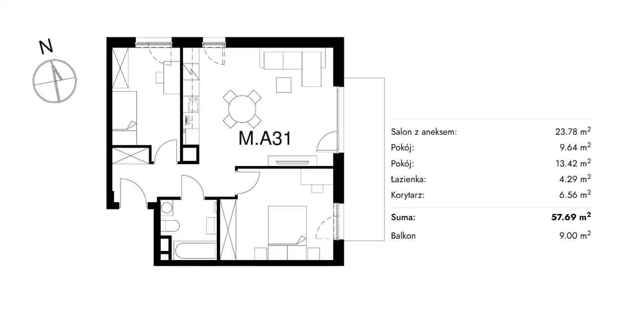 • Charakterystyka mieszkania 57.69 m2, 3 pokoje