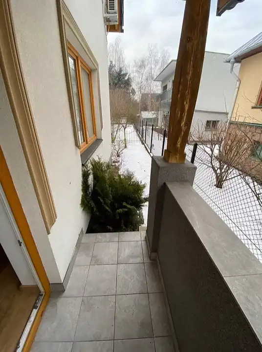Od frontu niewielki ogródek i wejście do budynku. Z salonu dodatkowe wyjście na ogródek za domem. Części działki znajdujące się poza obrębem budynku znajdują się we współposiadaniu wszystkich współwłaścicieli, zakres tego współposiadania nie jest umownie ustalony.