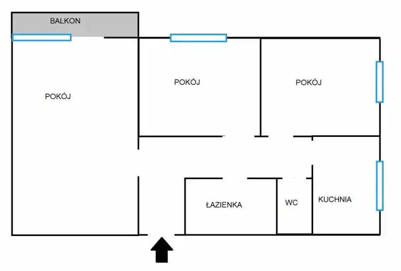 Obecny układ to przedpokój, trzy pokoje, osobna i jasna kuchnia, łazienka z i kabiną prysznicową, WC.