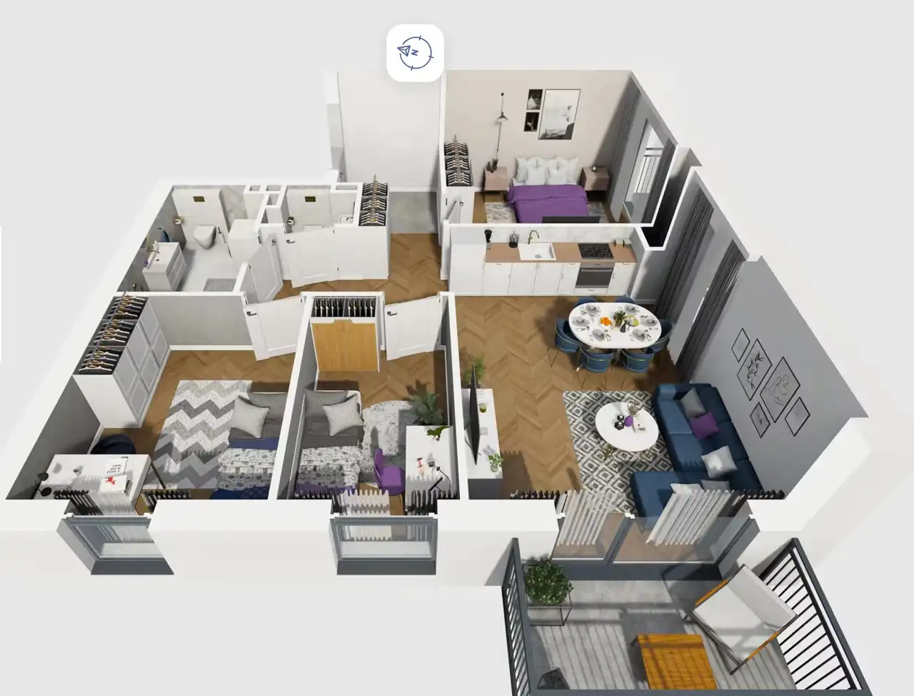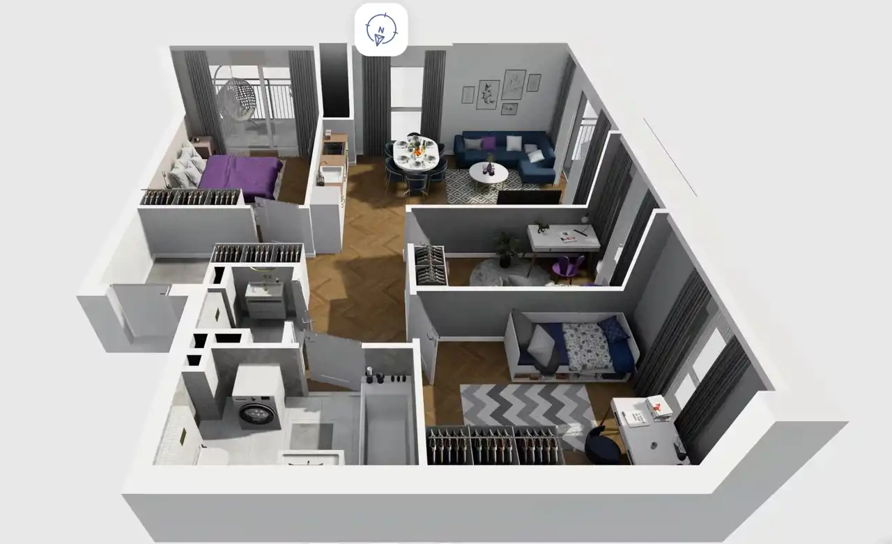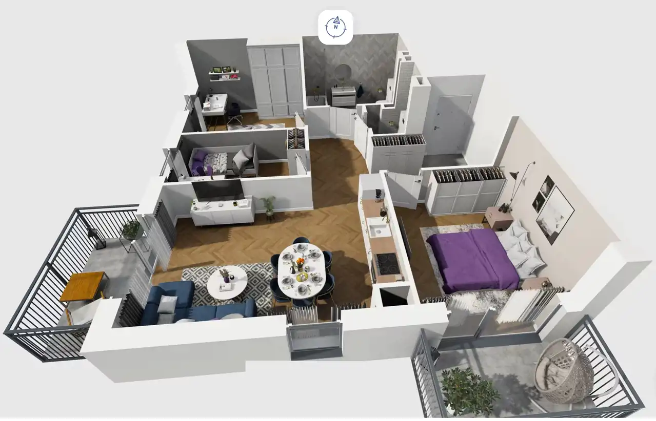 Mieszkanie składające się z salonu z aneksem kuchennym , trzech sypialni, przedpokoju, łazienki, WC oraz balkonu