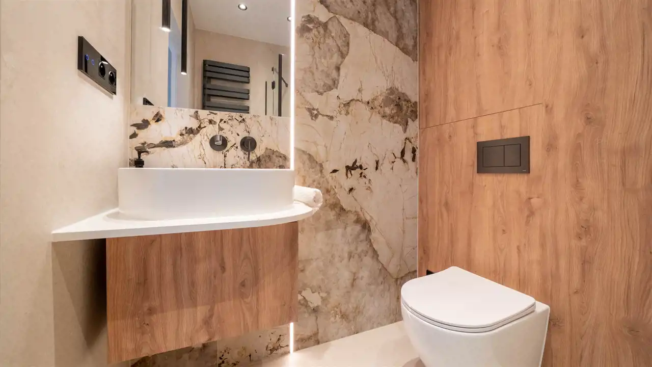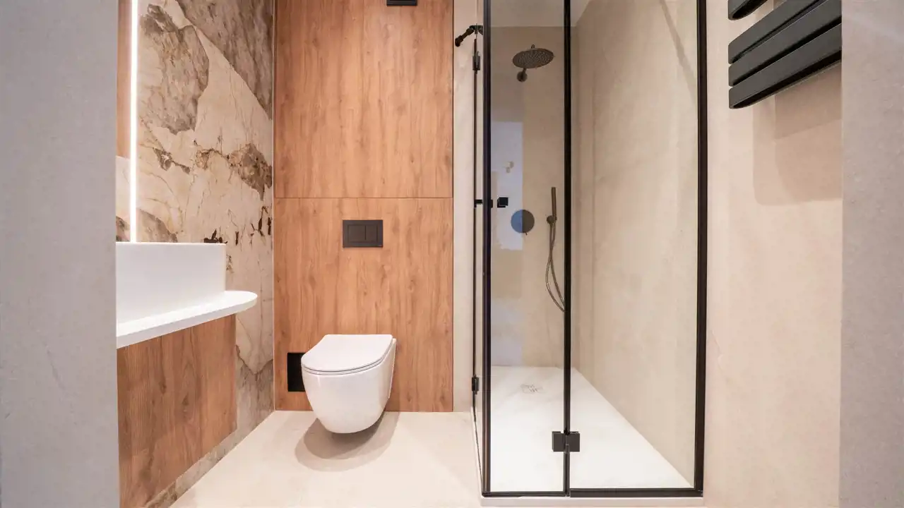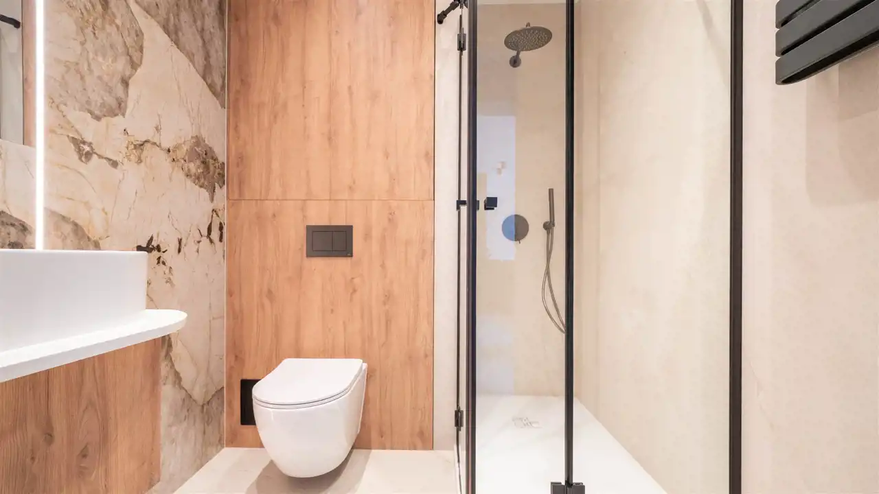 elegancka łazienka z prysznicem i WC.