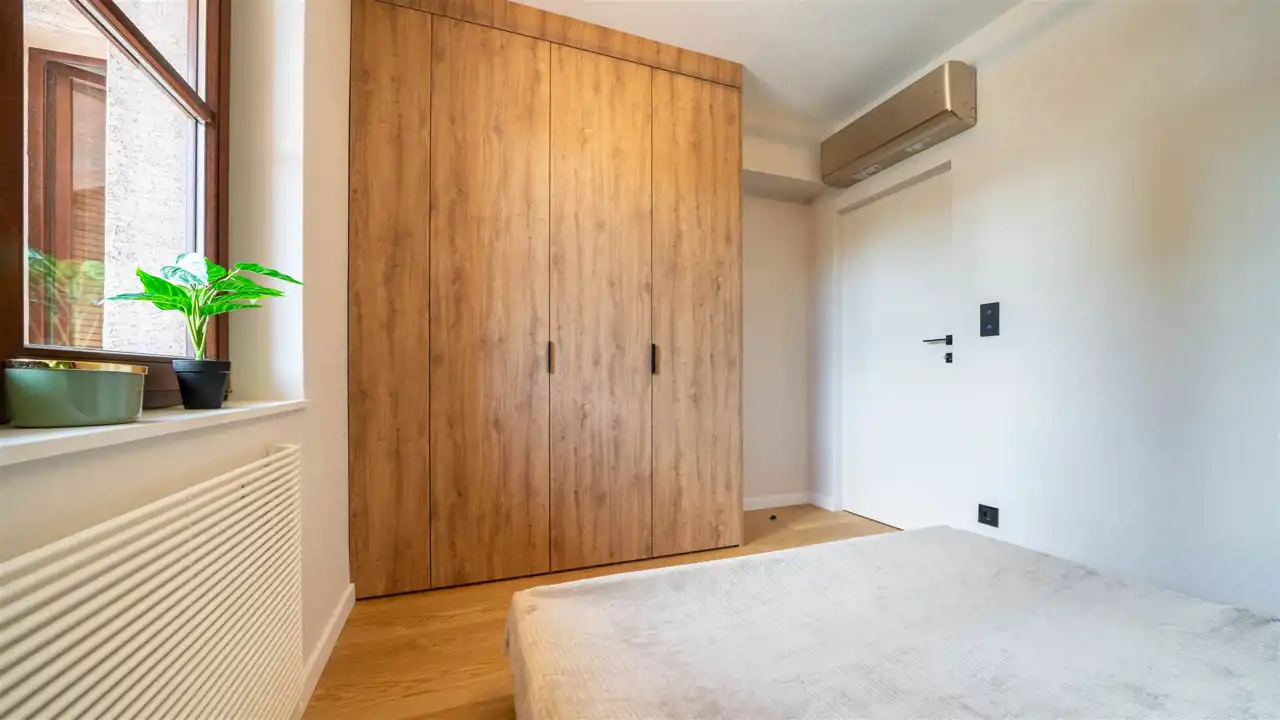 W mieszkaniu zainstalowano dwie jednostki klimatyzacji, co zapewnia komfort termiczny przez cały rok – zarówno w salonie, jak i w sypialni.
