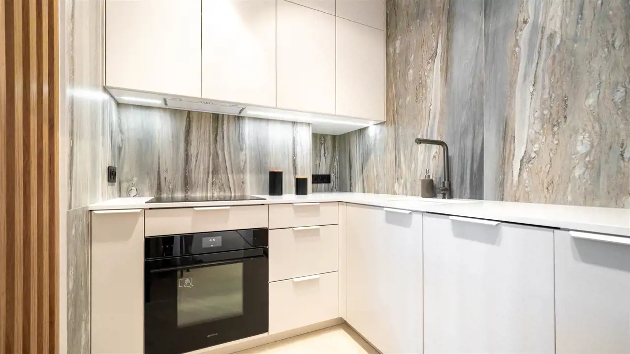 kuchnia z meblami wykonanymi na wymiar, wyposażona w wysokiej klasy sprzęt AGD marki SMEG,