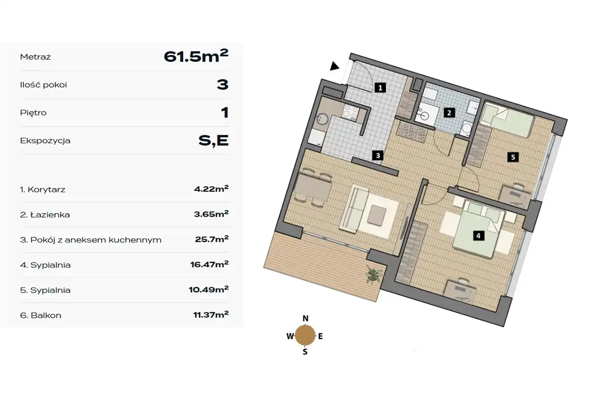 - Charakterystyka mieszkania 61.65 m2, 3 pokoje