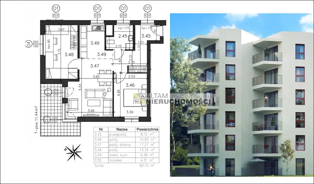 - Charakterystyka mieszkania 60.75 m2, 3 pokoje