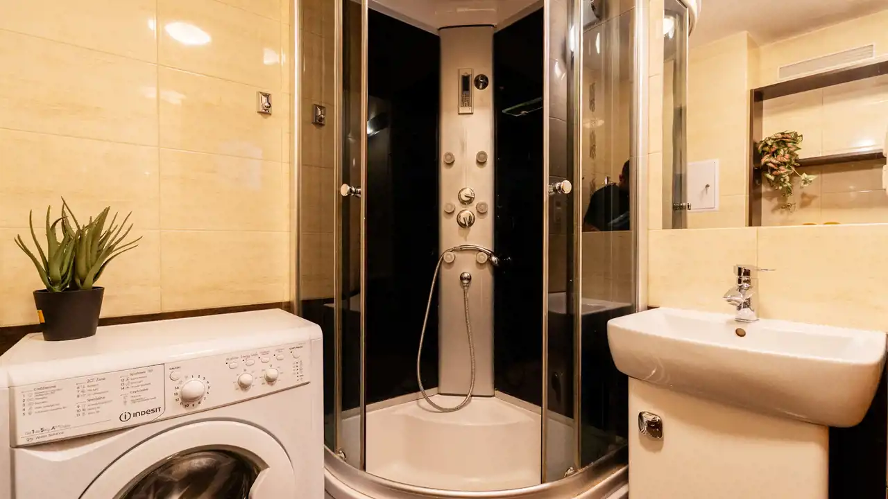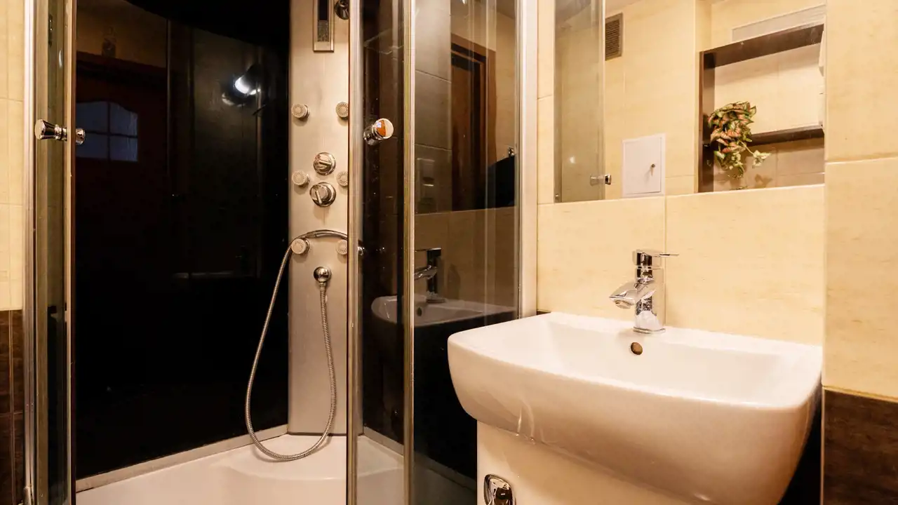 Funkcjonalna łazienka (4 m²) z kabiną prysznicową i osobne WC – wygoda na co dzień,