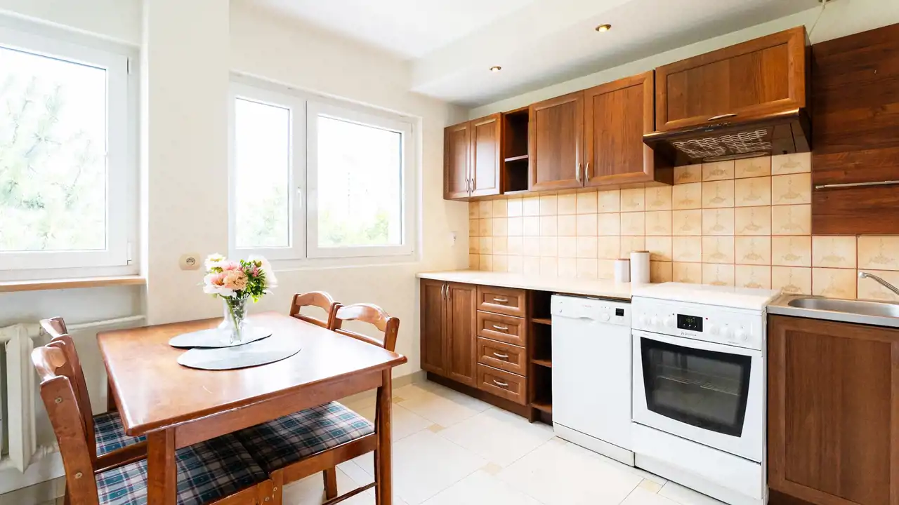 Kuchnia z oknem (13,5 m²) – w pełni wyposażona: zmywarka, lodówka i meble w cenie,
