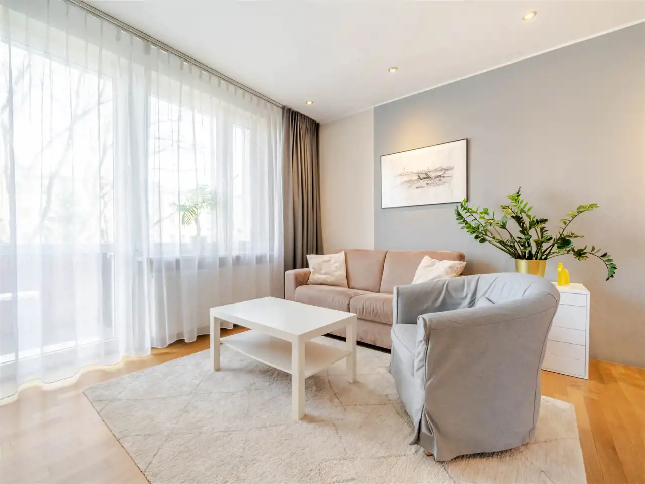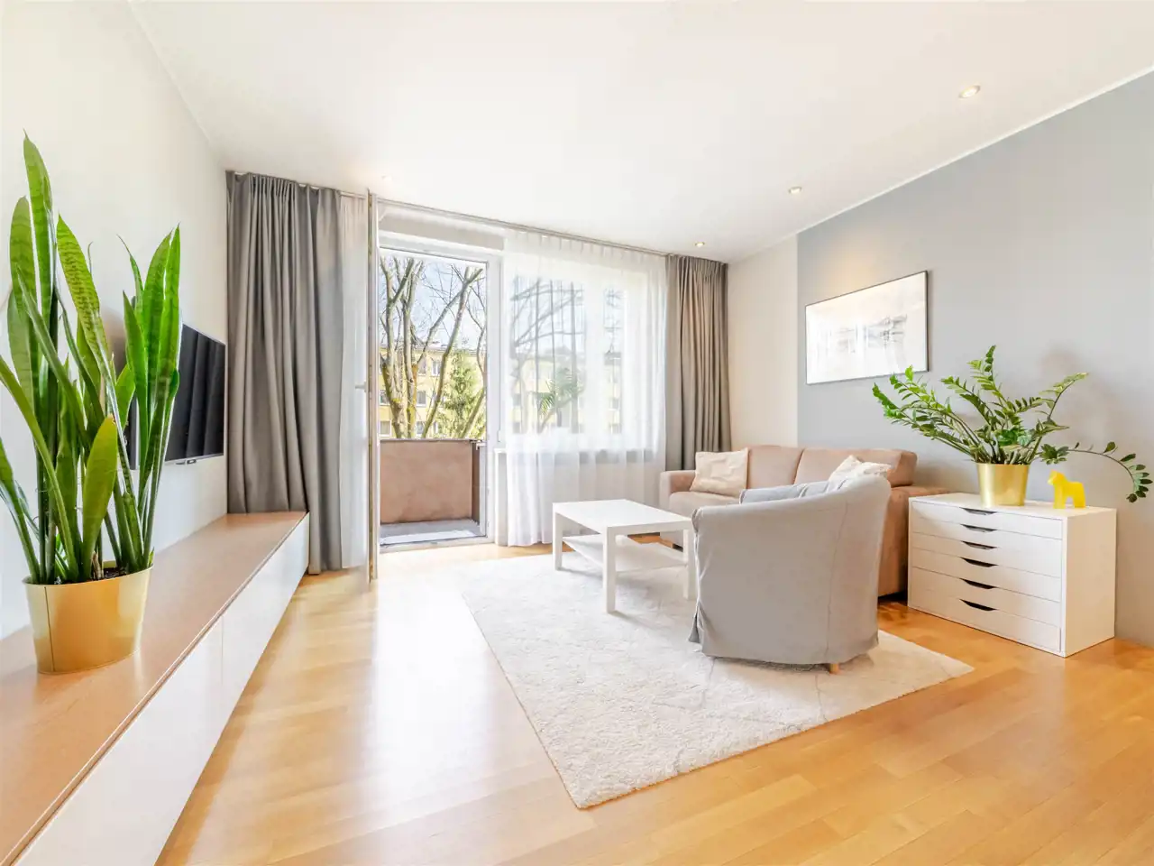 - piękny pokój dzienny, w pastelowych tonacjach, z wyjściem na balkon