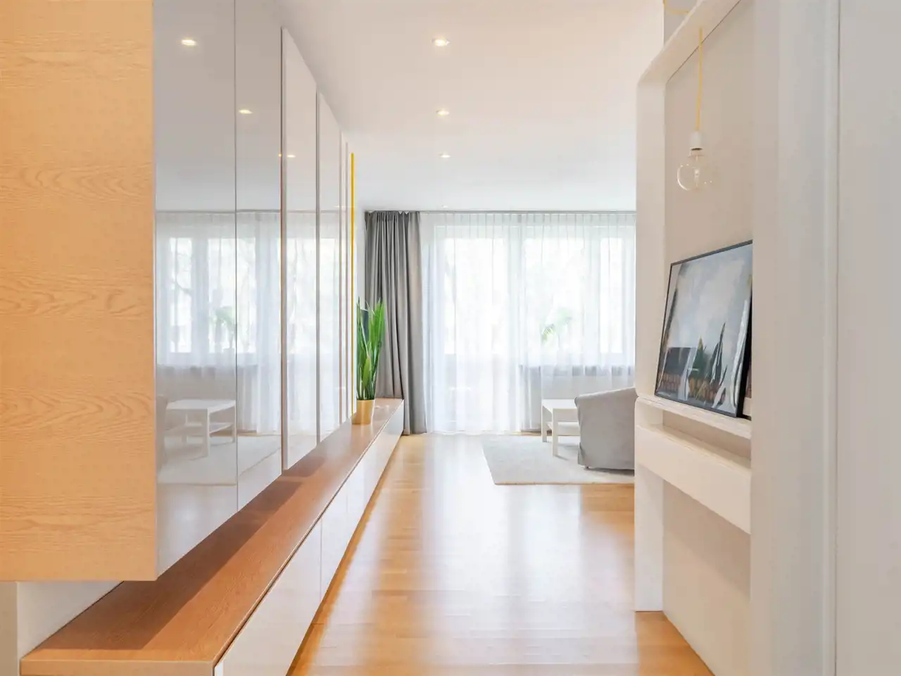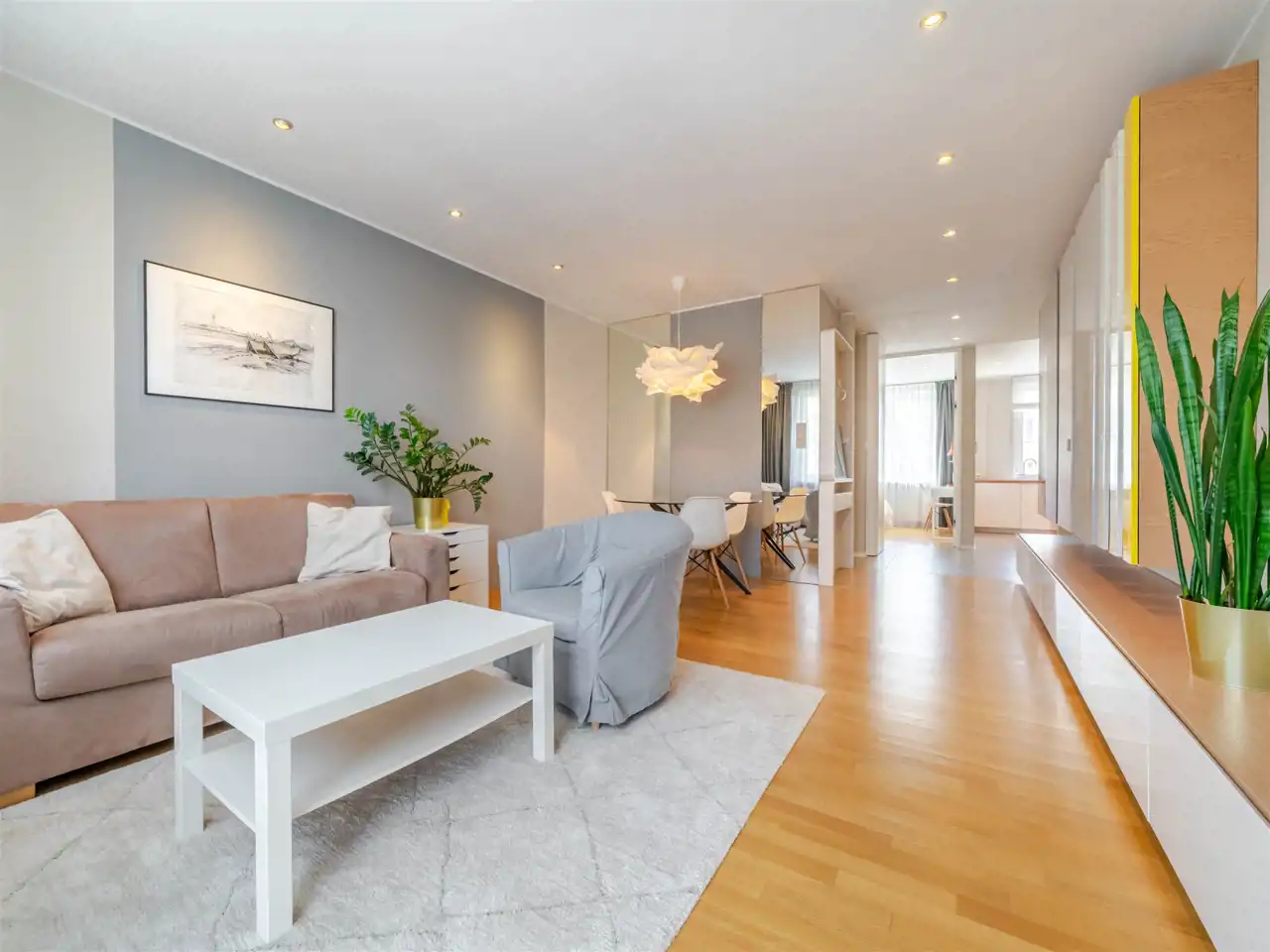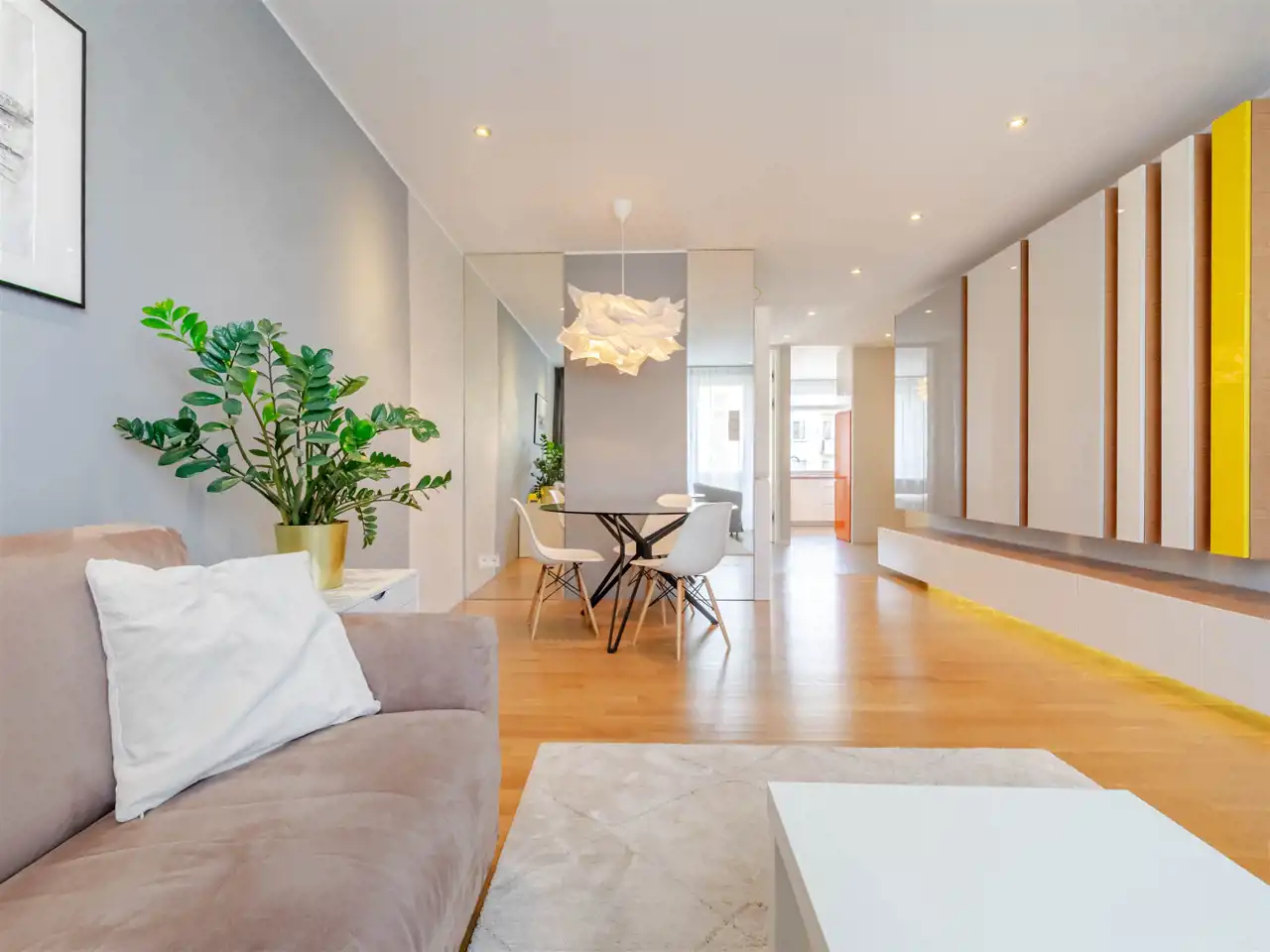 - w pokoju dziennym indywidualnie projektowana zabudowa z dużą ilością miejsc do przechowywania, dodatkowo ciekawie zaprojektowane oświetlenie