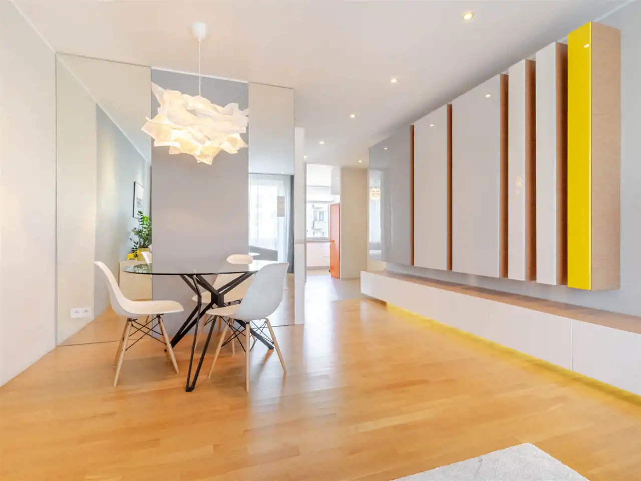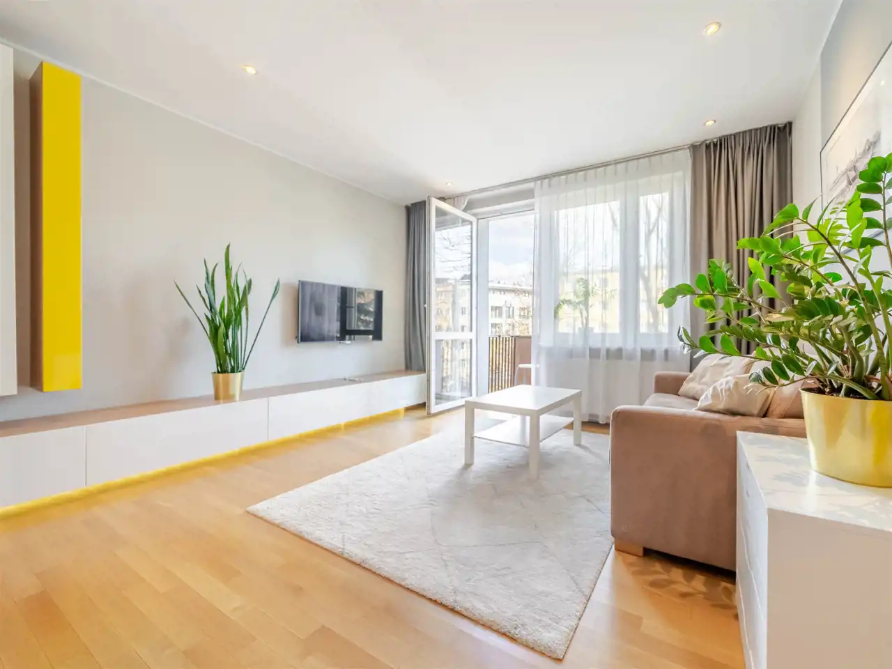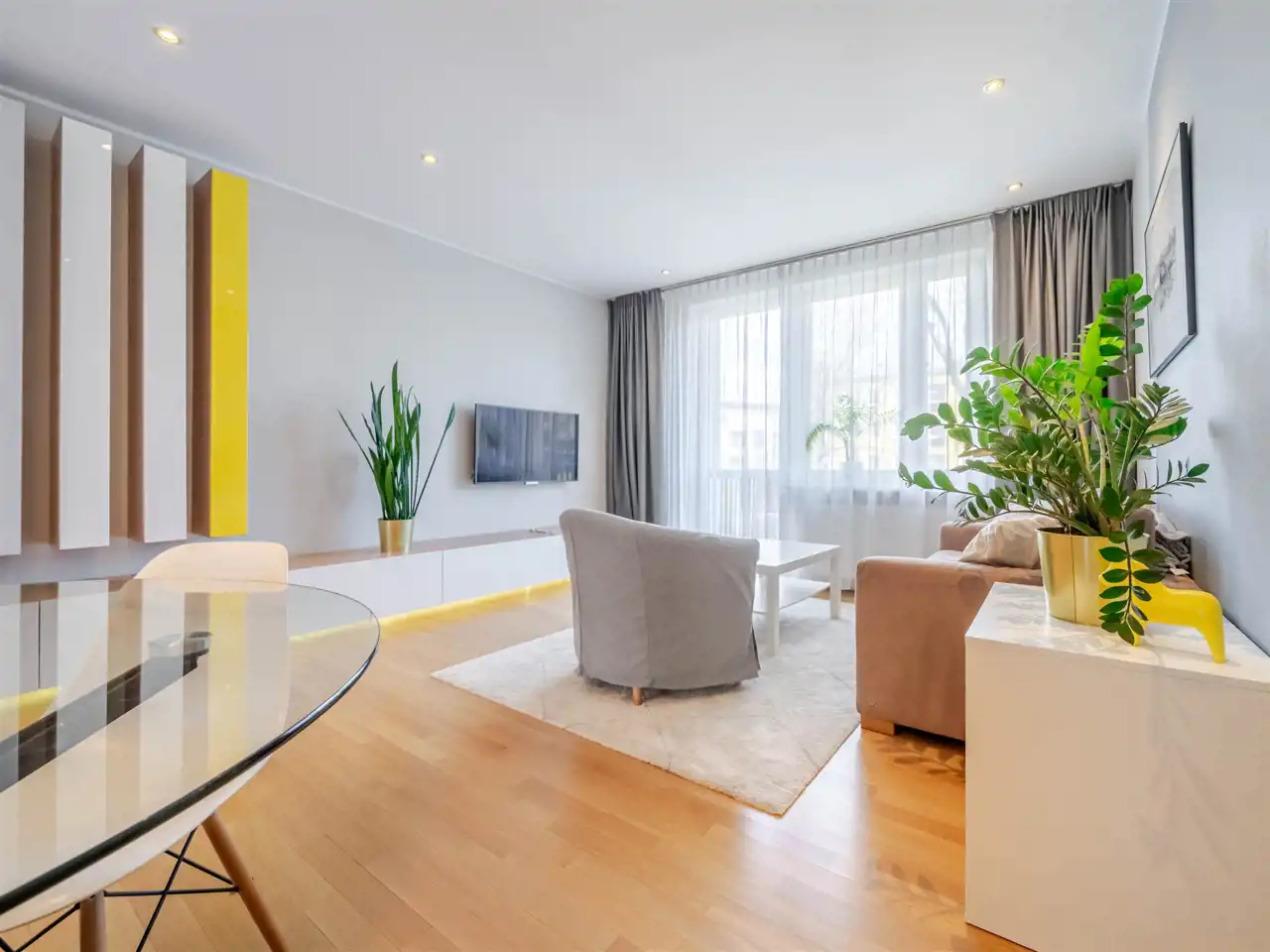 - w pokoju dziennym indywidualnie projektowana zabudowa z dużą ilością miejsc do przechowywania, dodatkowo ciekawie zaprojektowane oświetlenie