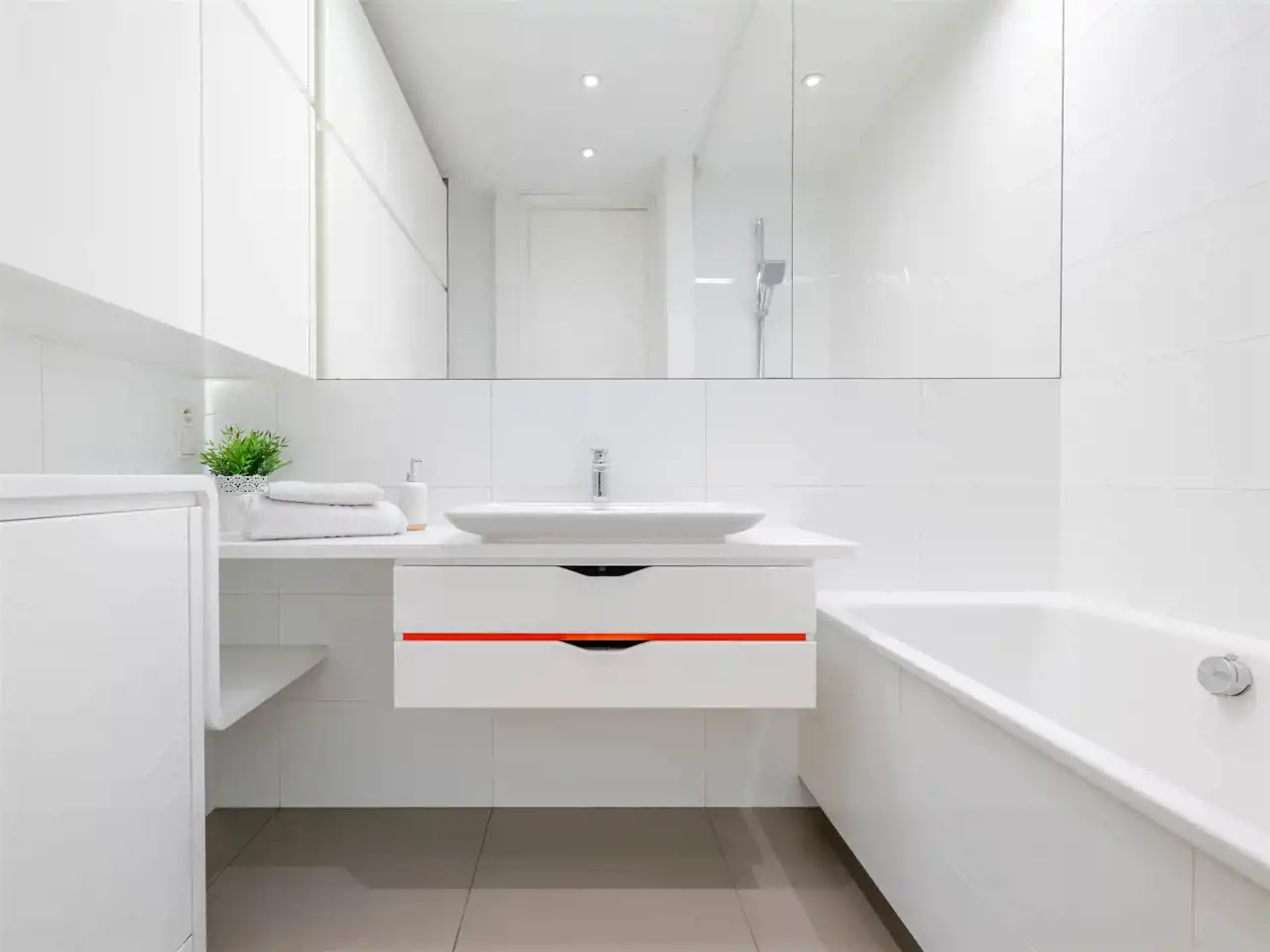- w łazience zabudowa meblowa na wymiar, blaty z konglomeratu, armatura Grohe/Esprit, ceramika Roca/Duravit