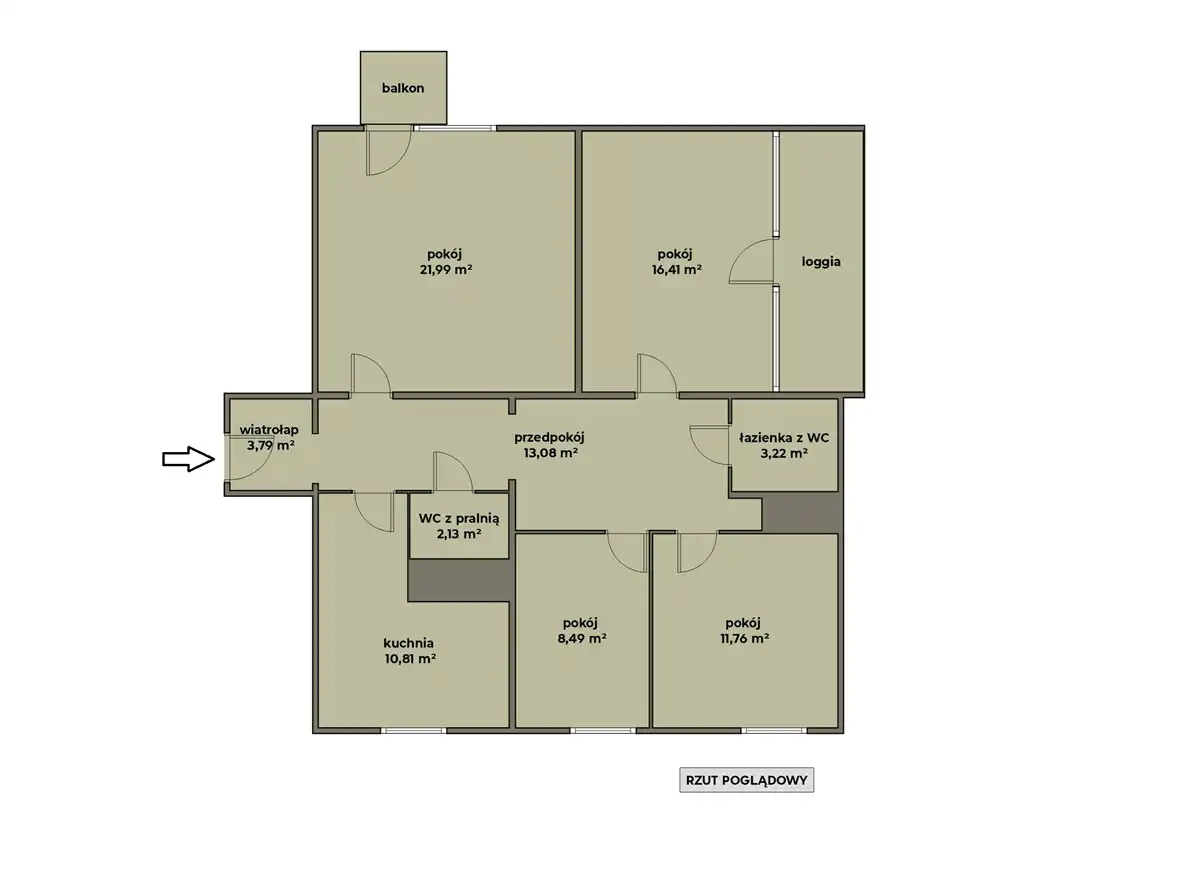 - pokój (16,41 m2) z wyjściem na loggię