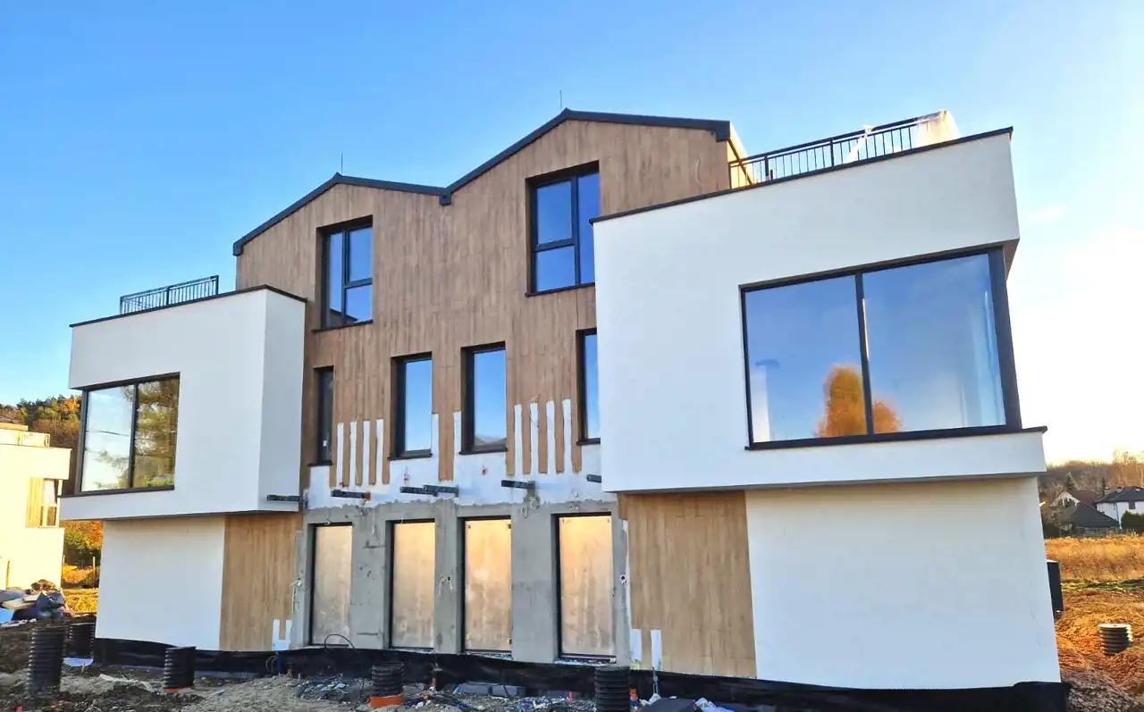 - kompletne wykończenie elewacji (deska polimerowa Greinplast, kolor śliwa-łącka oraz tynk sylikonowy, kolor biały),
