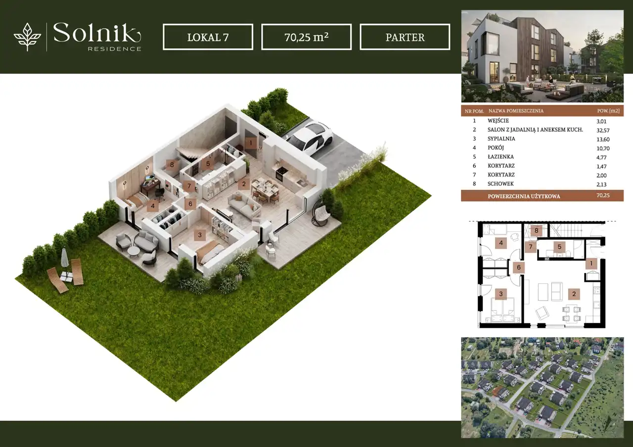 wejście (3,01m2), salon z jadalnią i aneksem kuchennym (32,57m2), sypialnia (13,6m2), pokój (10,7m2), łazienka (4,77m2), korytarz (1,47m2), korytarz (2m2), schowek (2,13m2)