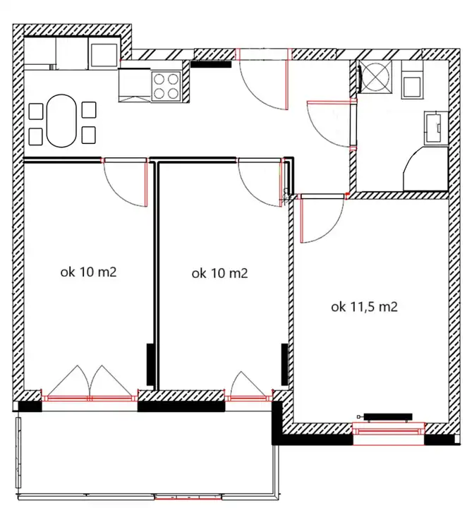 Na metraż mieszkania składają trzy niezależne pokoje, osobna kuchnia, przedpokój, łazienka