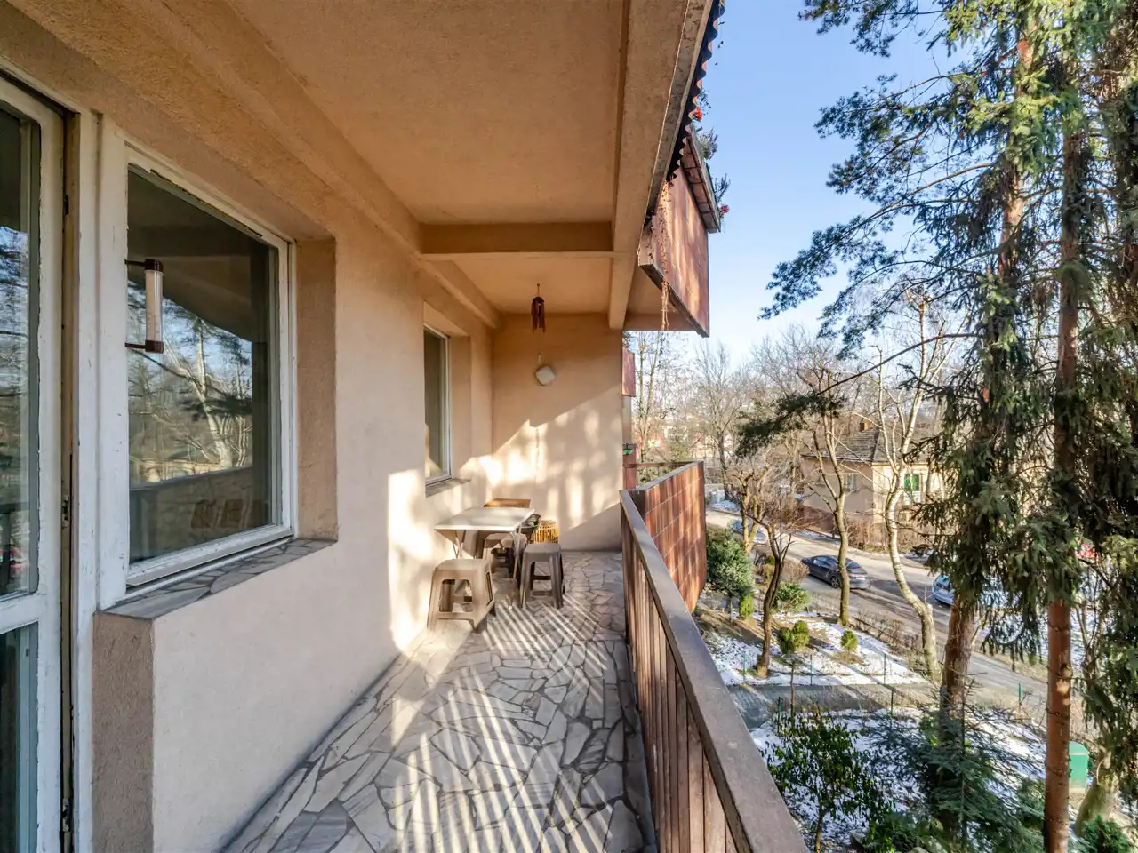 Bardzo dużym atutem mieszkania jest jego przestronny balkon z wyjątkowym, relaksującym widokiem na piękne świerki.