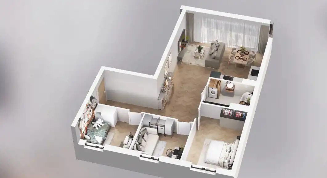 Mieszkanie składające się z salonu z aneksem kuchennym, trzech pokoi, przedpokoju, łazienki oraz balkonu o pow. 8m2