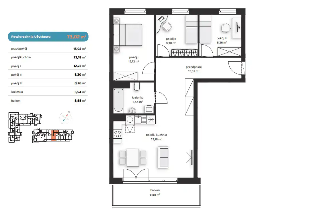 - Charakterystyka mieszkania 73.02 m2, 4 pokoje
