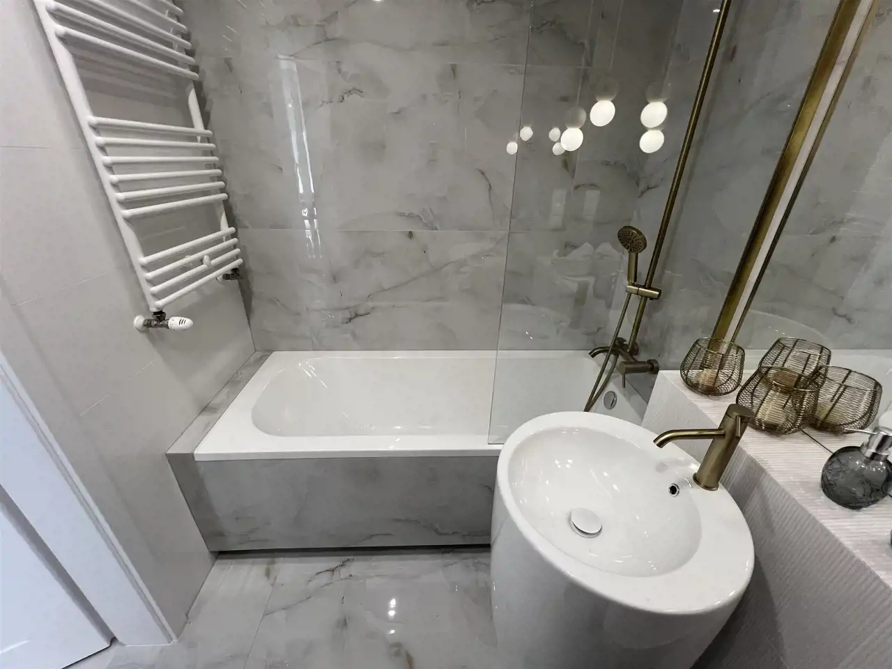 Nowoczesna łazienka z wanną, prysznicem oraz deszczownicą