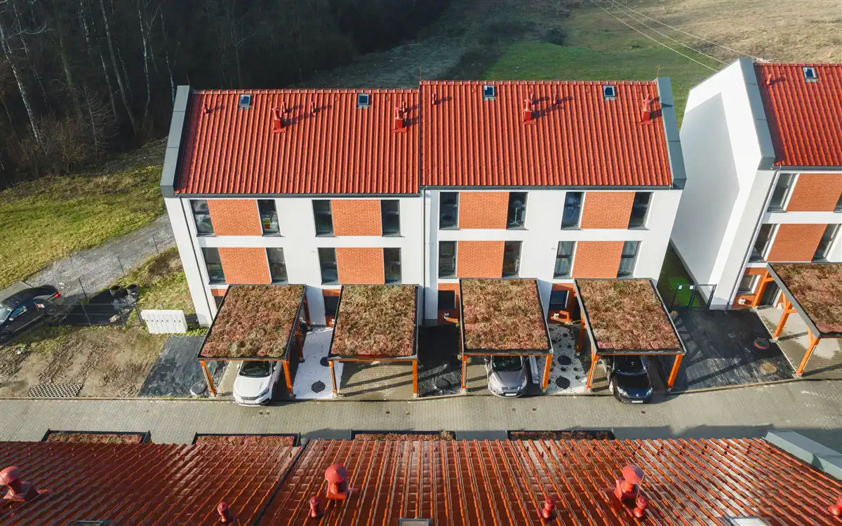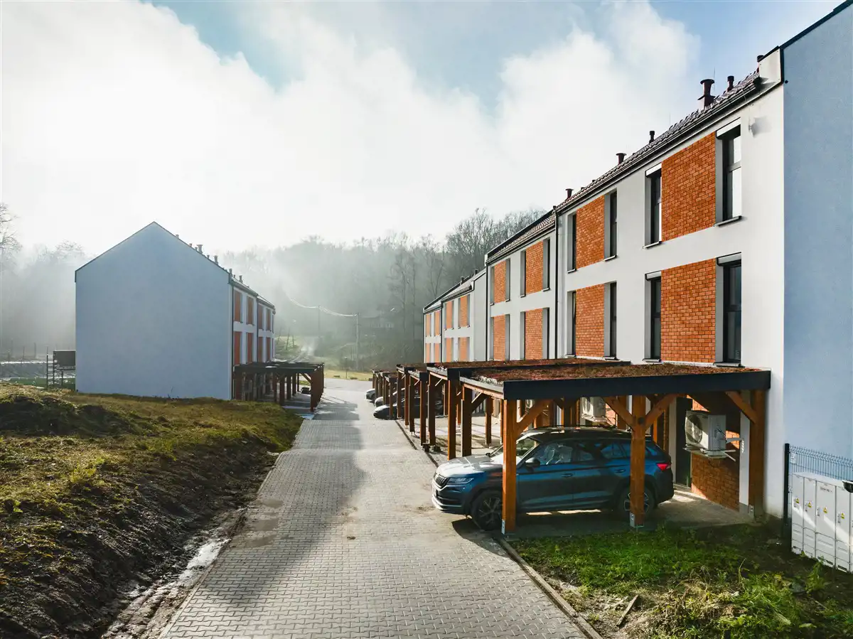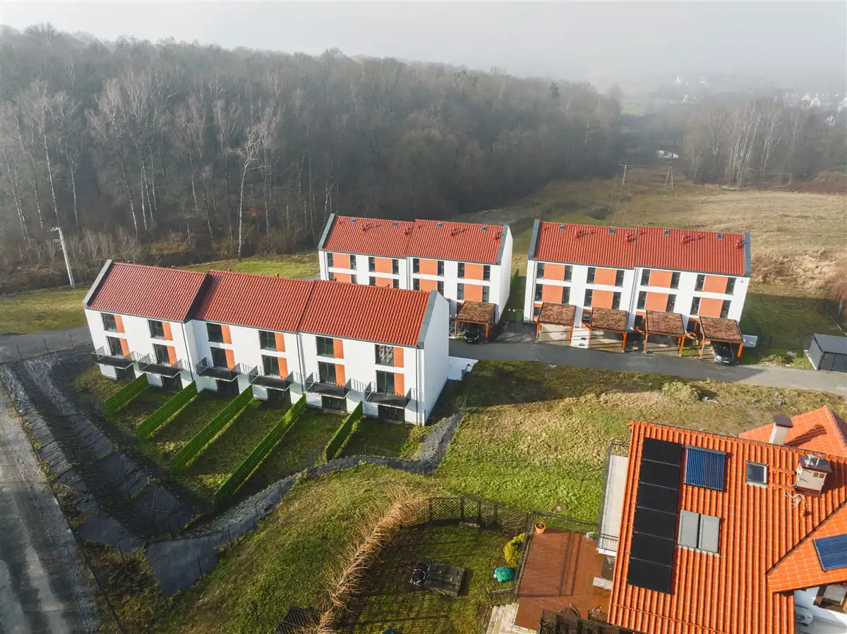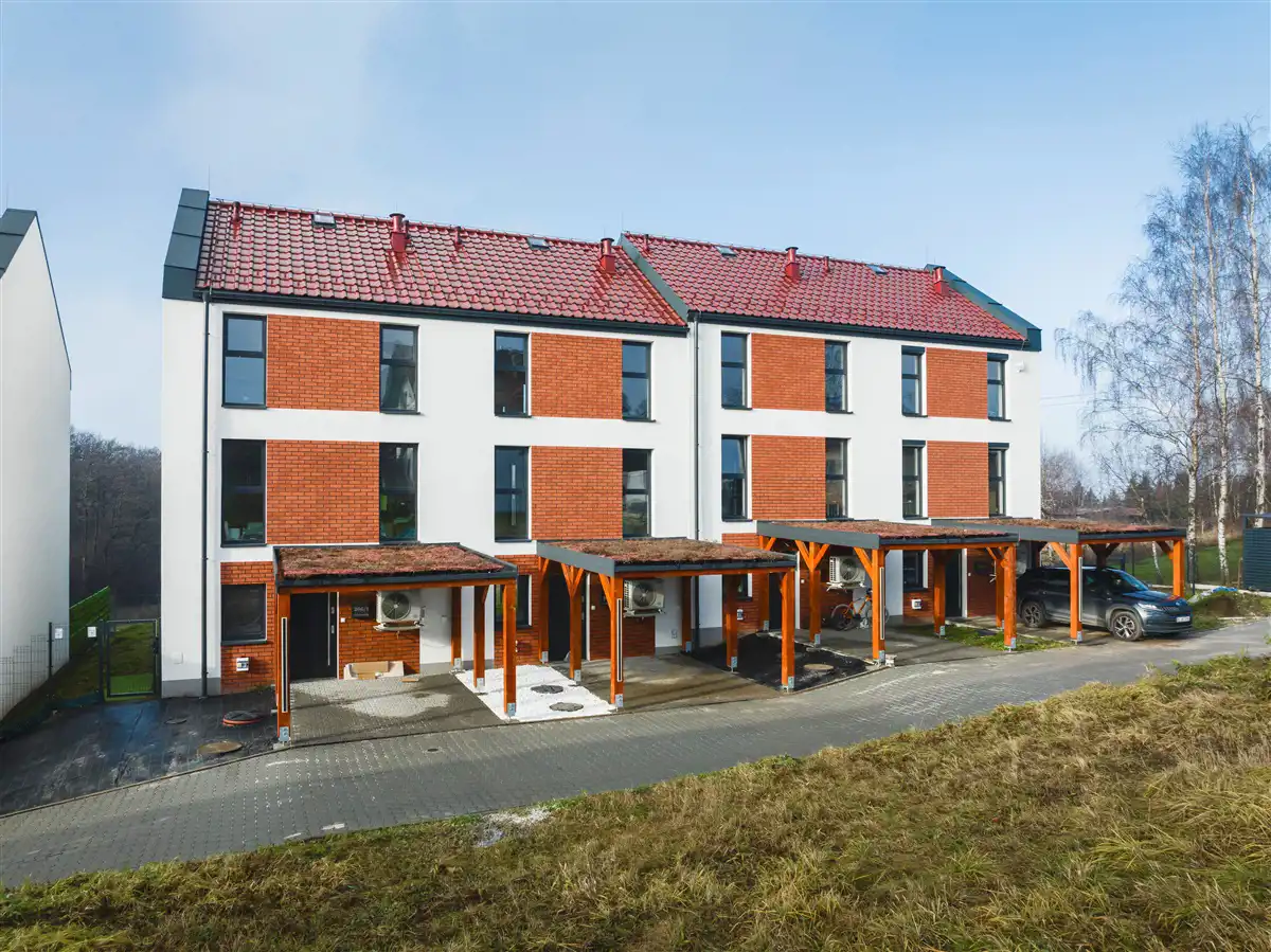 Nowe ogrodzone osiedle domów jednorodzinnych dwulokalowych z podziałem pionowym, urządzone w taki sposób, że każde mieszkanie funkcjonalnie jest jak trzykondygnacyjny dom w zabudowie szeregowej.