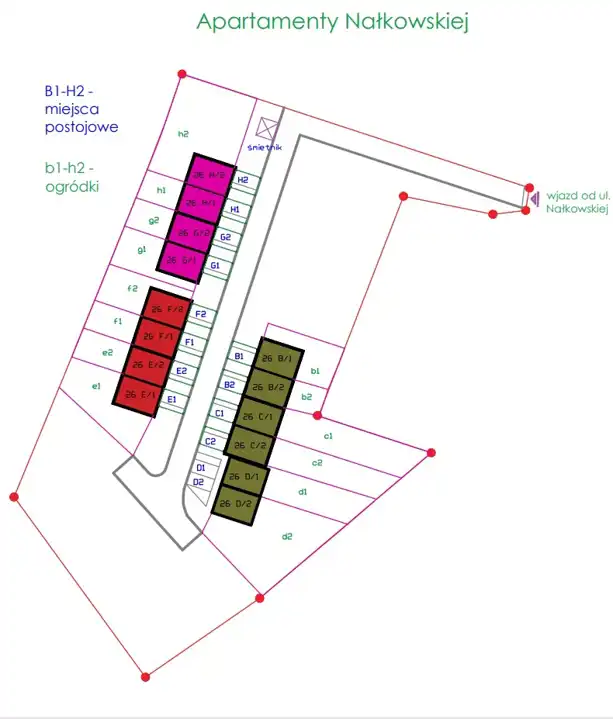 Obecnie do sprzedaży są zarówno apartamenty położone skrajnie, jak i w środku szeregu budynków, możliwość wyboru apartamentu (w zależności od położenia różnią się one wielkością ogródka i ceną).