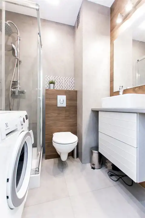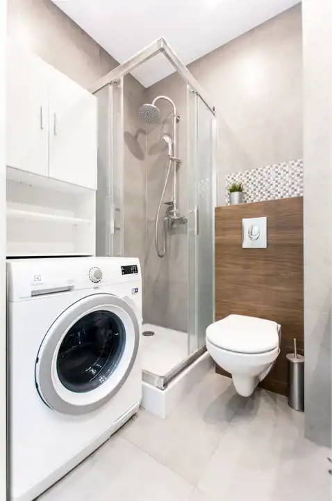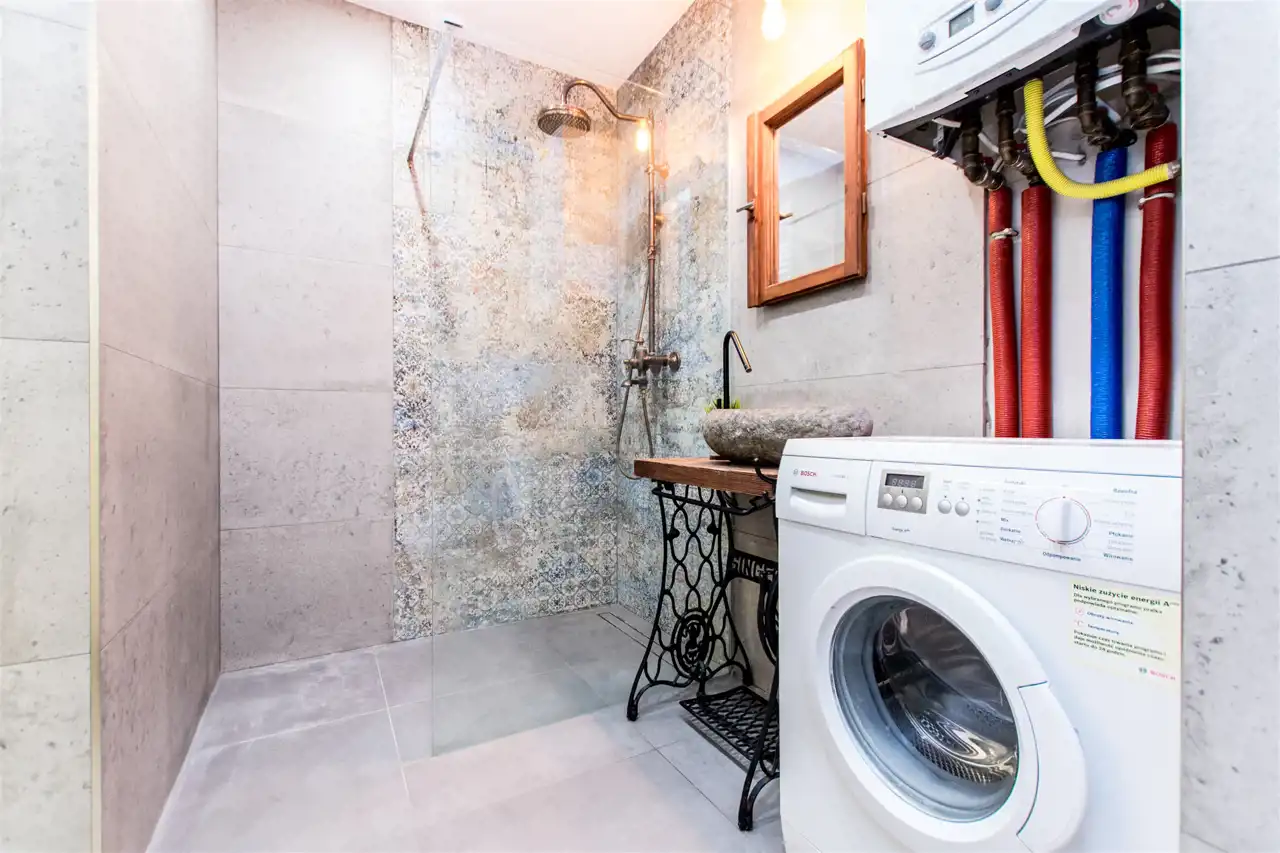 Aneks kuchenny w salonie posiada sporo miejsca roboczego do przygotowania posiłków i obejmuje: wojnostojącą lodówko-zamrażarkę, płytę grzewczą, piekarnik. Komfort użytkowania podnoszą dwie łazienki (każda z własną pralką) oraz duża ilość miejsca na przechowywanie m. in. dzięki oddzielnej garderobie oraz 2 komórkom lokatorskim w garażu.