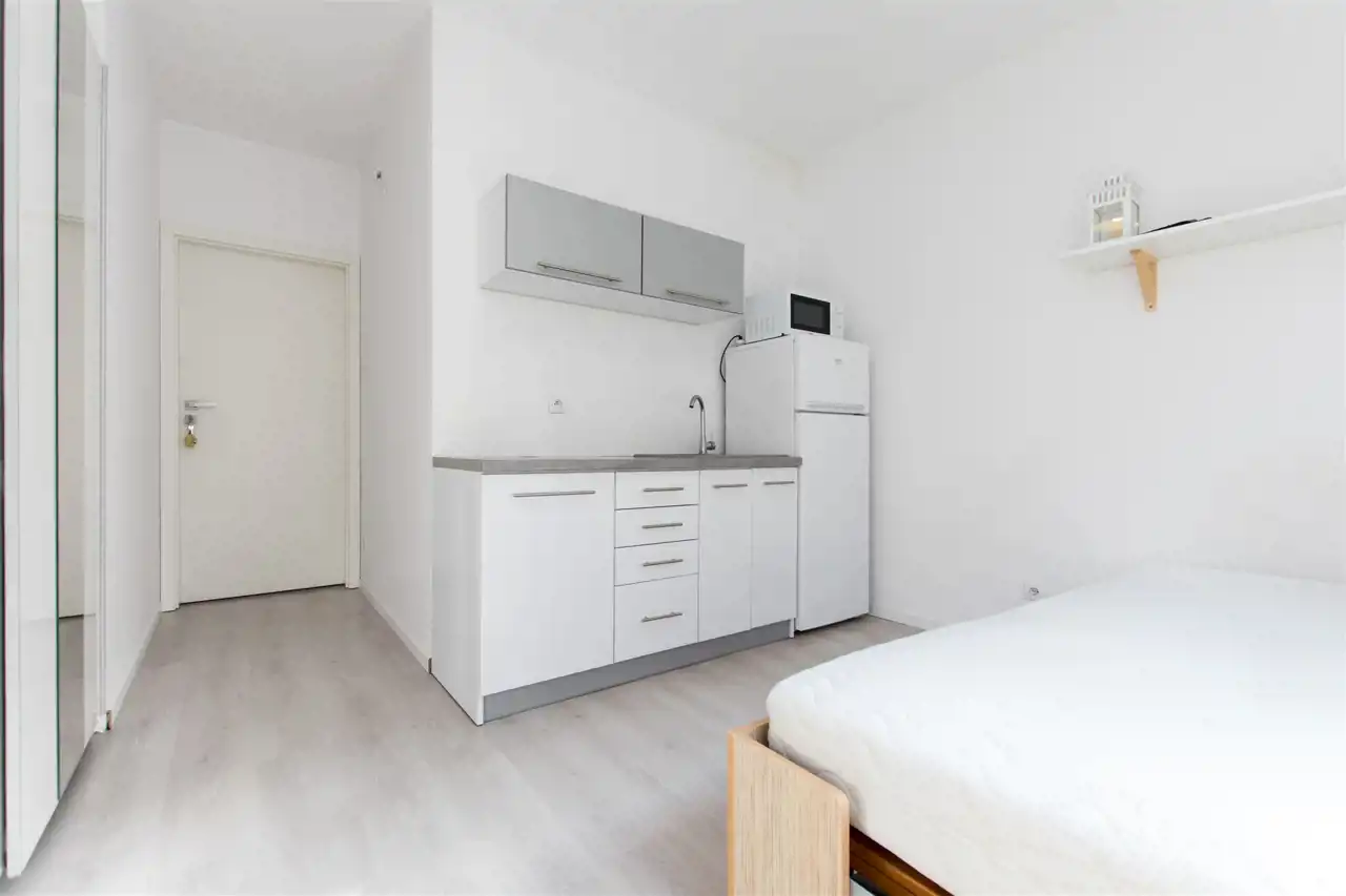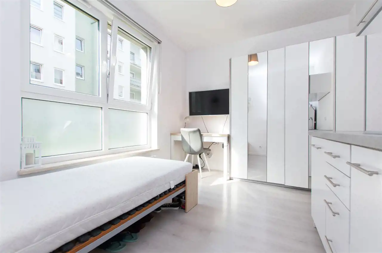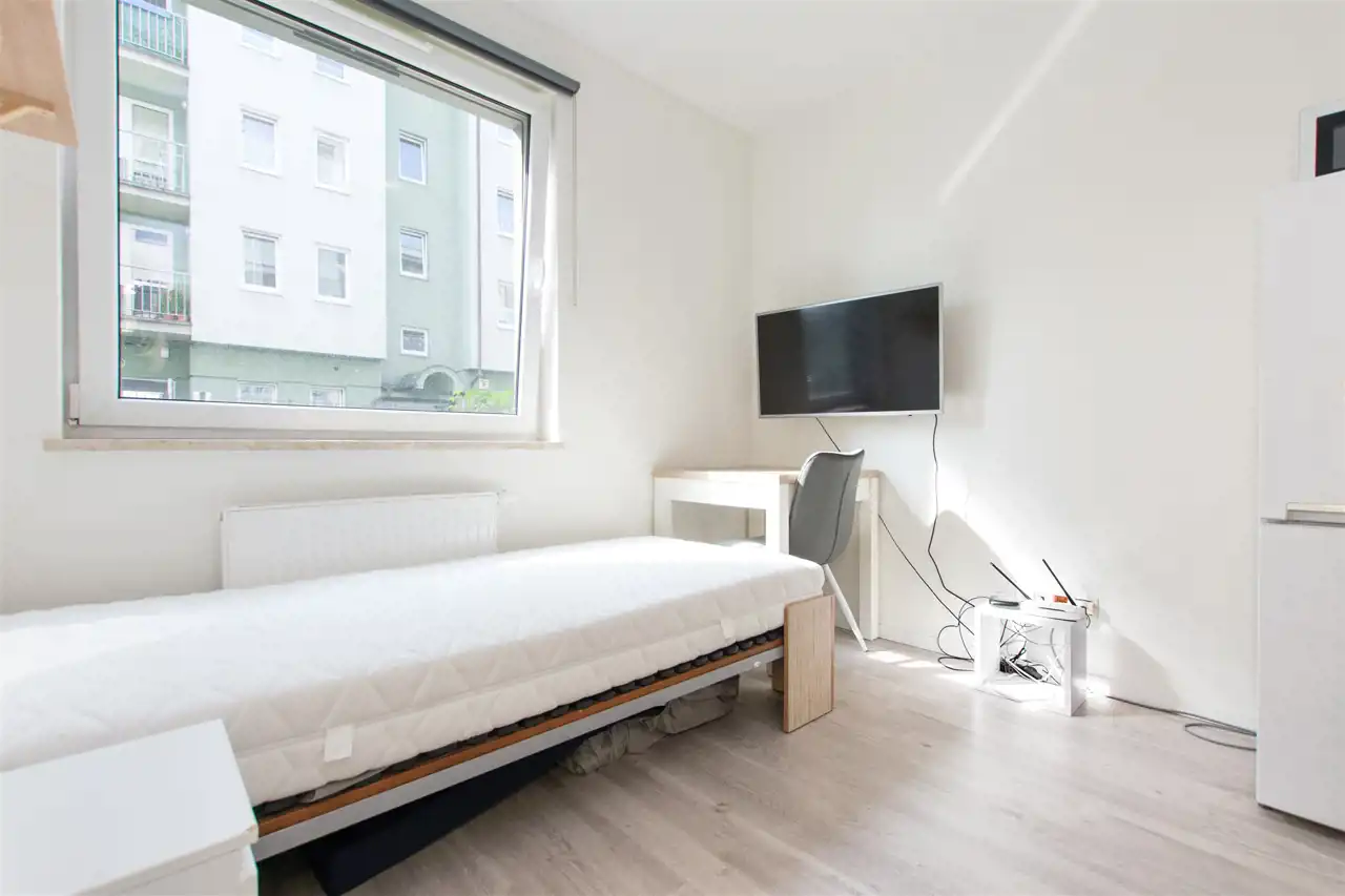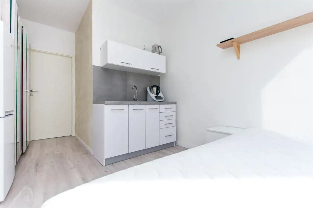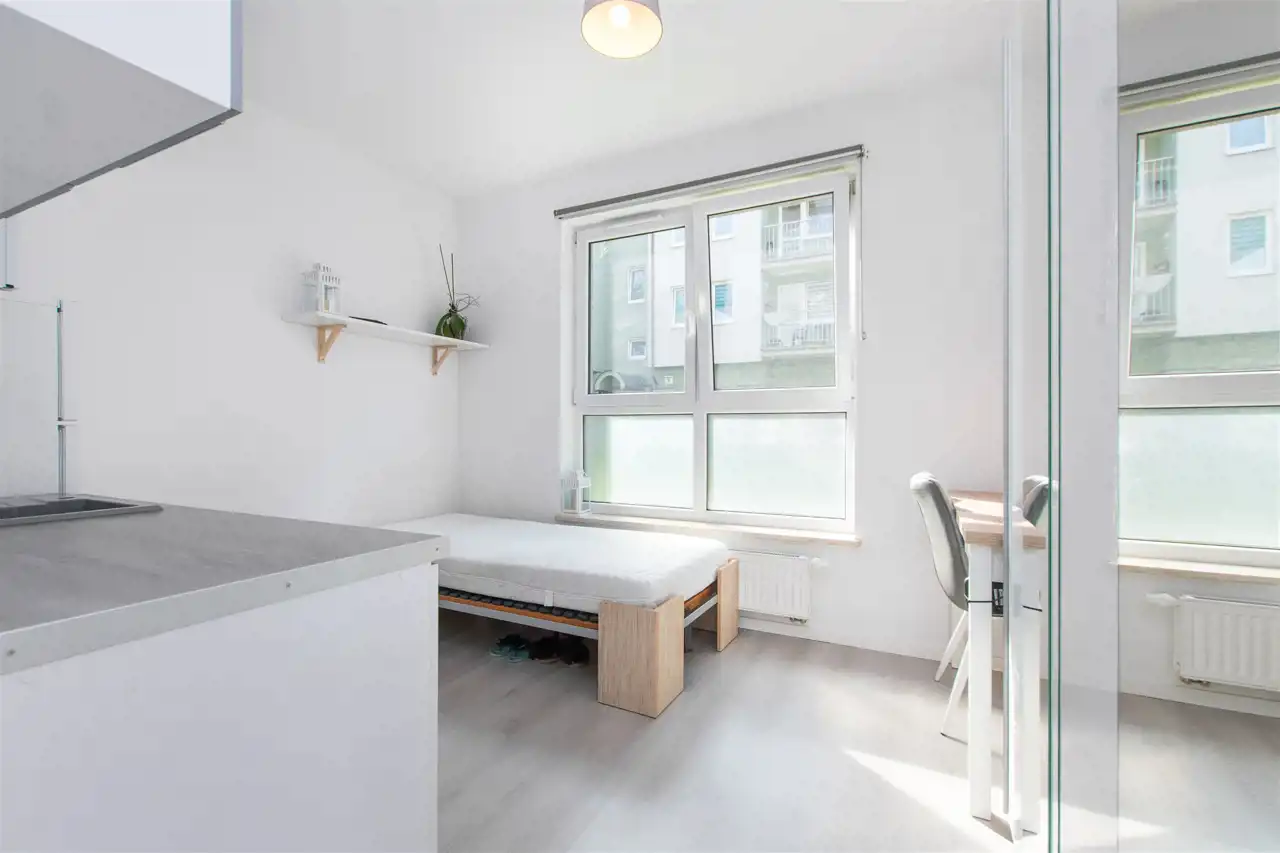 - I samodzielna sypialnia z aneksem kuchennym, TV, szafą i biurkiem,