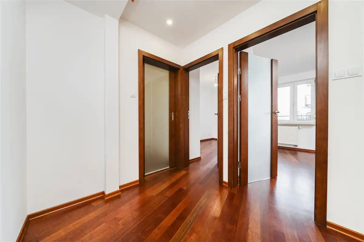 Na podłogach deska egzotyczna merbau (świeżo wycyklinowana) i płytki.