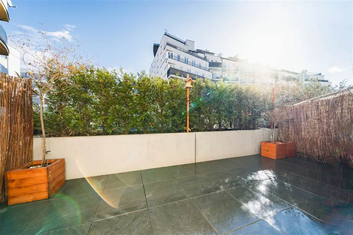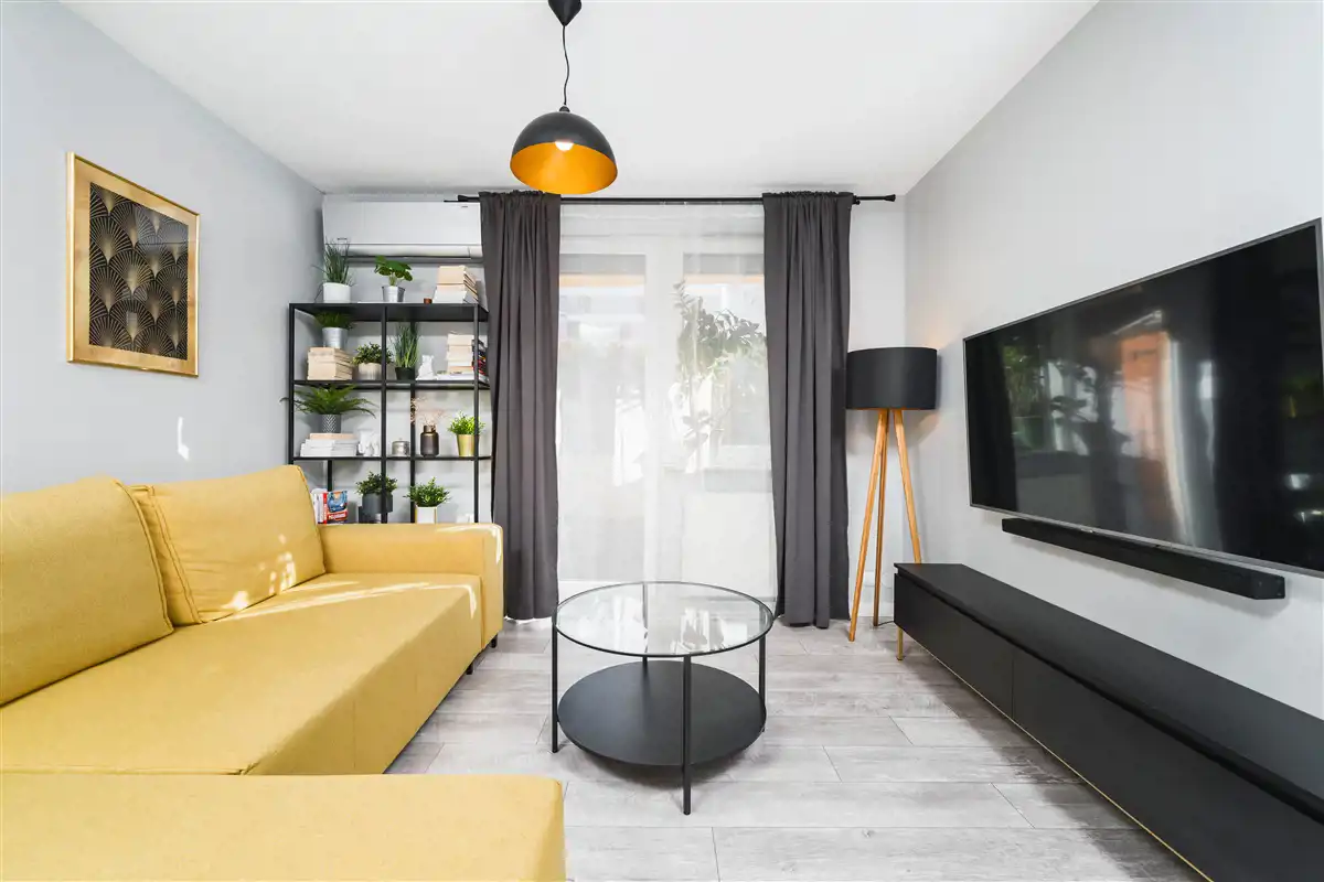 Mieszkanie o powierzchni użytkowej 63,01 m2 zlokalizowane na parterze 6 piętrowego budynku z windą. Budynek został wybudowany 2007 roku. Mieszkanie posiada duży taras o powierzchni 19,5 m2. Na tarasie znajduje się domek narzędziowy, a także zestaw wypoczynkowy. Wystawa mieszkania na stronę wschodnią oraz północną. Mieszkanie sprzedawane z całym wyposażeniem. Wykończone bardzo wysokiej jakości materiałami. Kuchnia wyposażona w dużą lodówkę oraz mikrofale firmy Samsung, płytę indukcyjną, piekarnik oraz zmywarkę firmy Electrolux. Okap firmy Kernau. Ekspres do kawy firmy Simens. Aneks kuchenny wykonany z mebli na wymiar. Blat oraz zlew wykonany ze spieku kwarcowego Calacatta. W łazience znajduje się wanna z funkcją prysznica oraz pralka. W salonie znajduje się telewizor firmy Samsung z soundbarem. Drugi telewizor Samsunga znajduje się w sypialni. Mieszkanie jest wyposażone w klimatyzacje. Na podłogach położone są panele. Okna PCV z roletami zewnętrznymi w każdym z okien. W mieszkaniu znajduje się duża ilość zabudowanych szaf wnękowych robionych na wymiar.