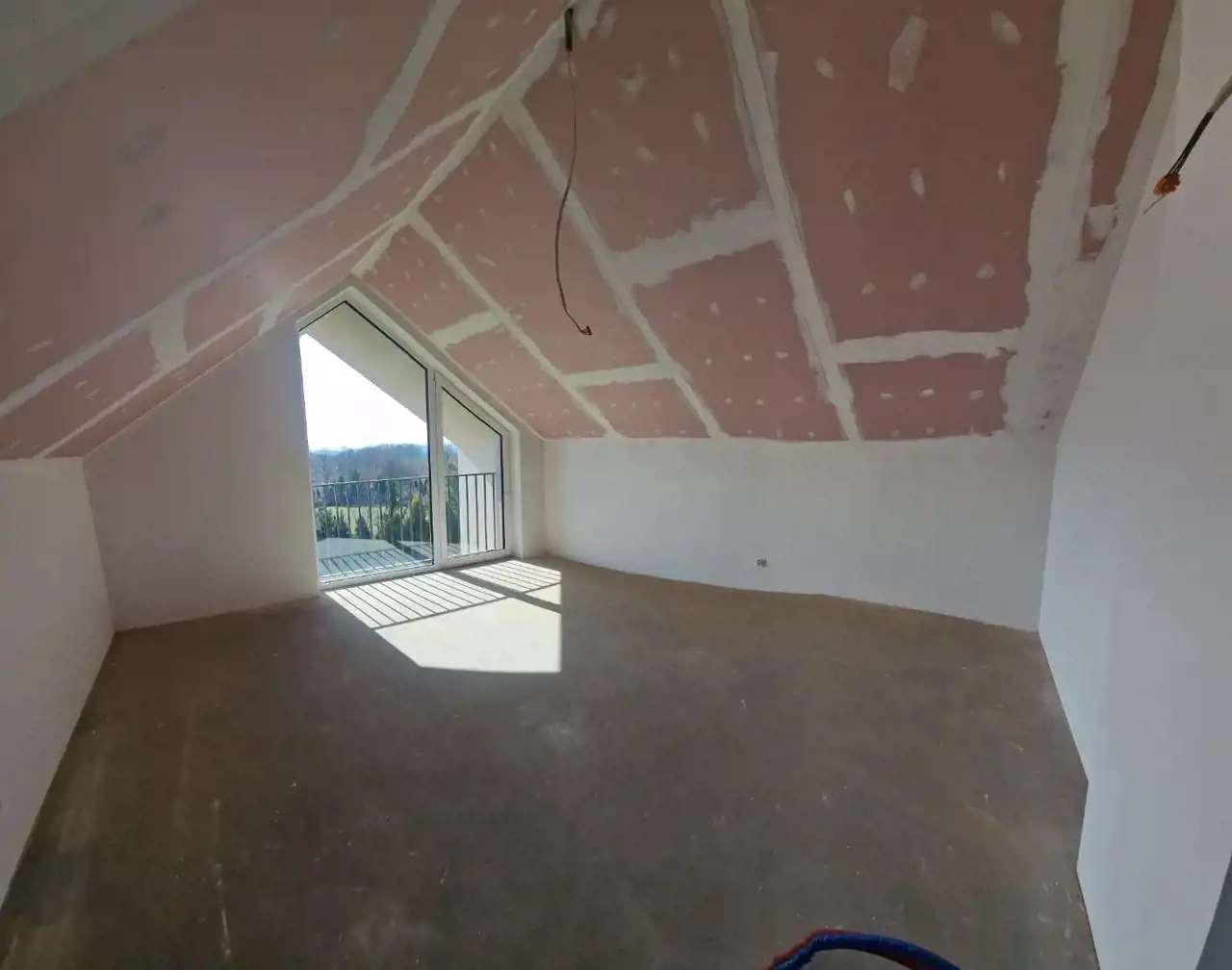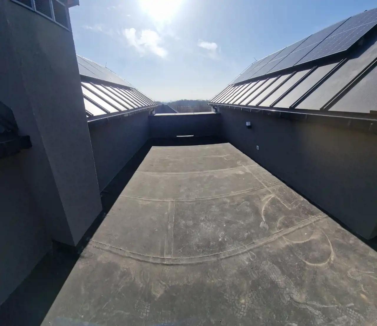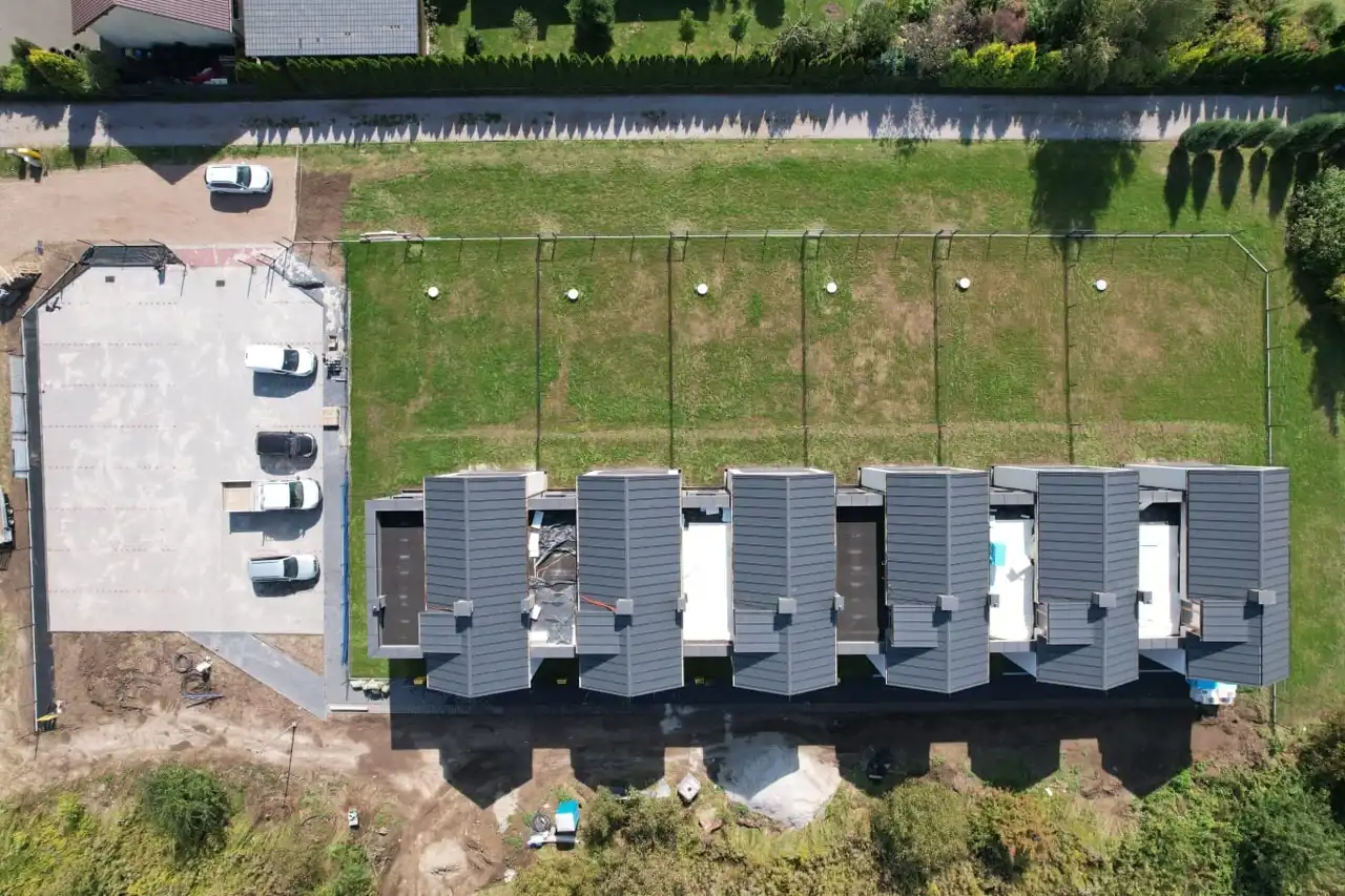 - dach: dach dwuspadowy (blacha) + dach płaski i izolacja EPDM,