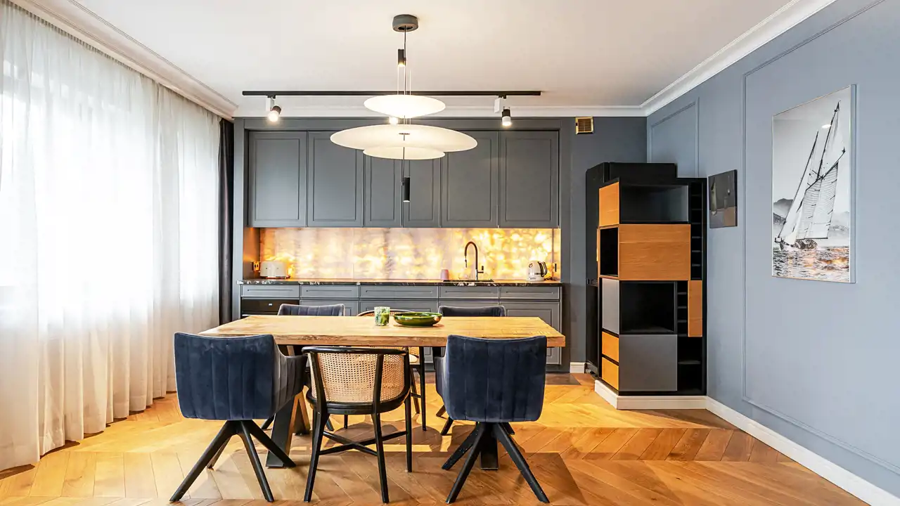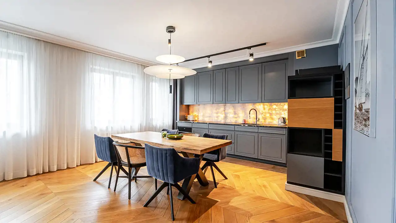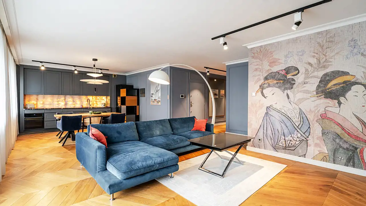 Wnętrze zostało wykończone w bardzo wysokim standardzie, z użyciem starannie dobranych materiałów i mebli najwyższej jakości. Każdy detal został przemyślany i dopracowany, tworząc spójną, ponadczasową estetykę.