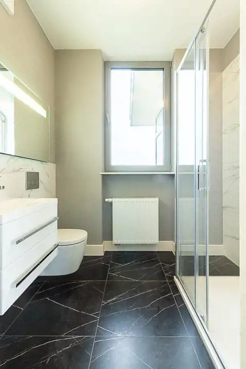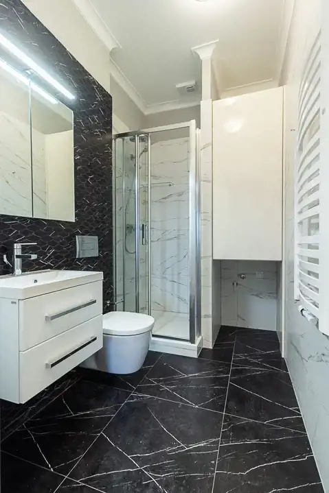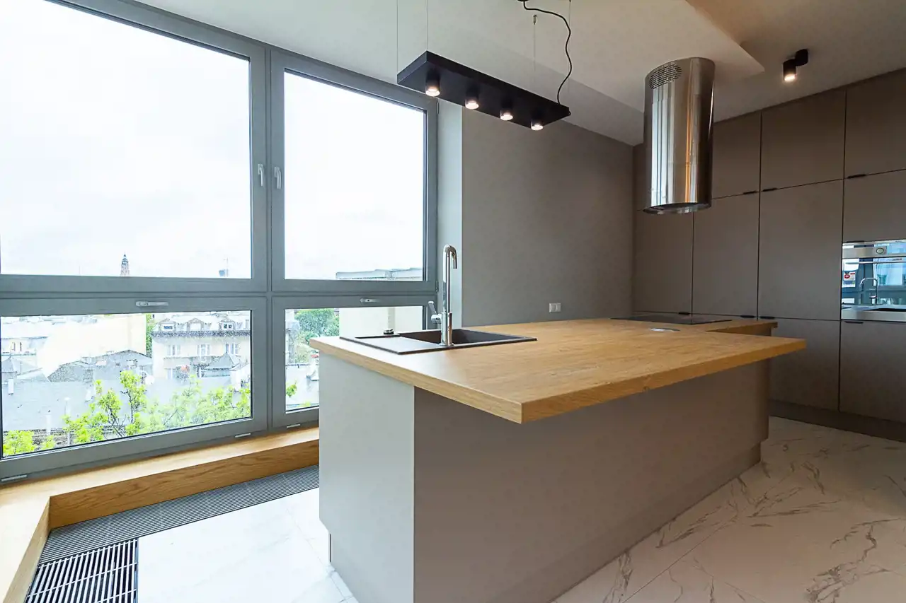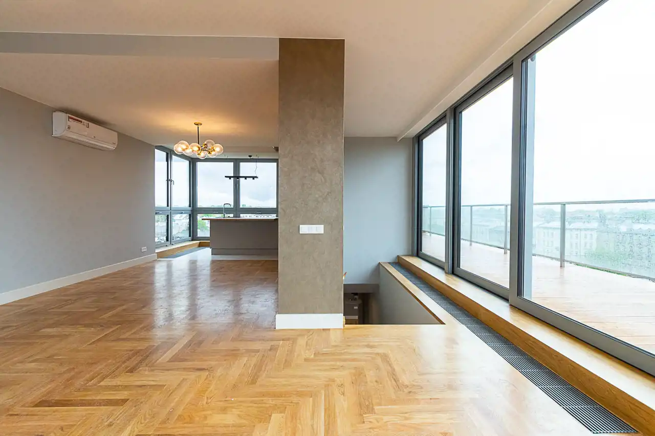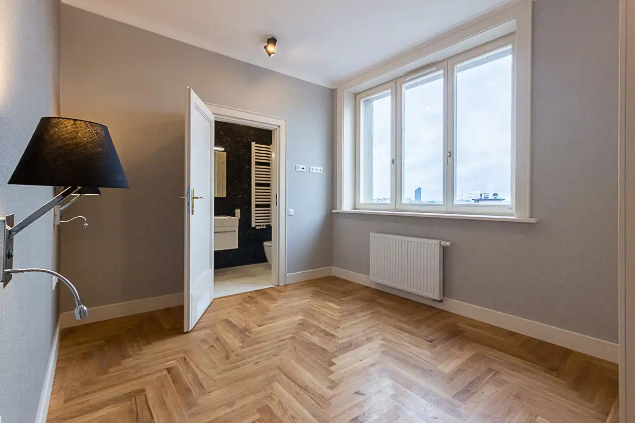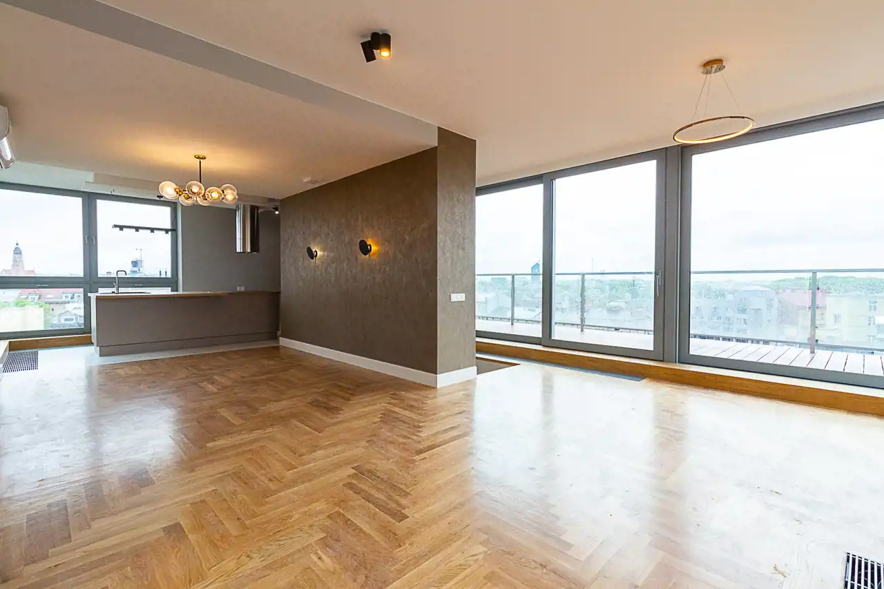 Apartament wykończony w wysokim standardzie, wyposażony w klimatyzację oraz ogrzewanie miejskie.
