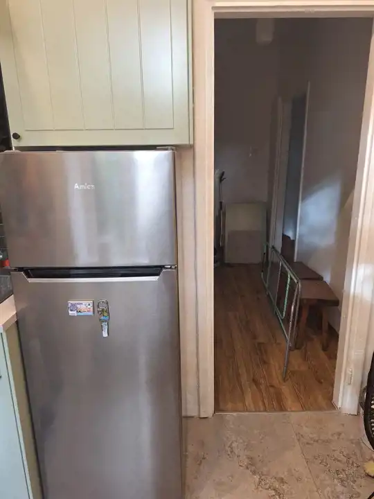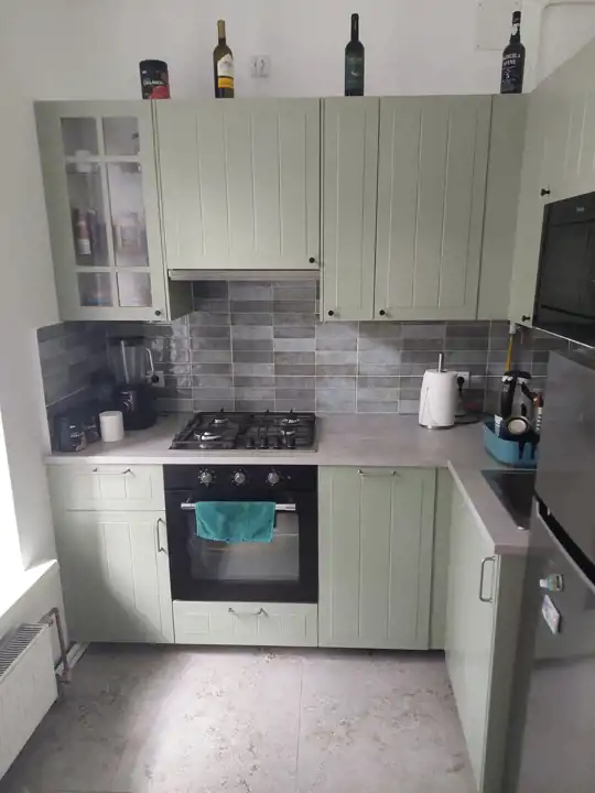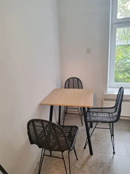 - Oddzielnej, z nowo wykonanymi meblami, jasnej kuchni wyposażonej w szafki, kuchnię gazową, lodówkę , stół i krzesła.