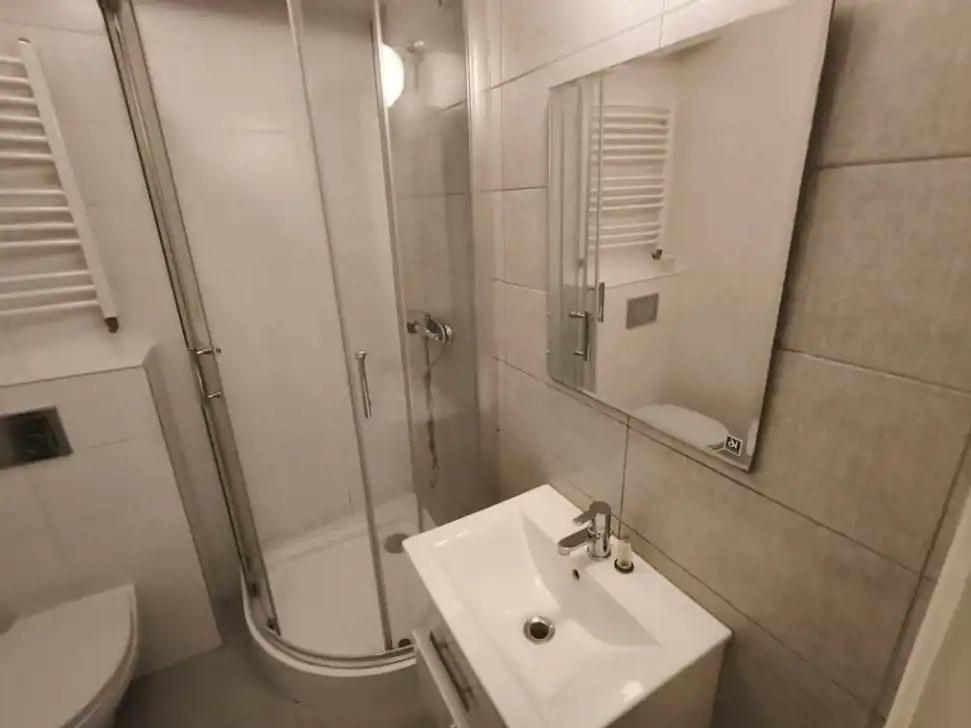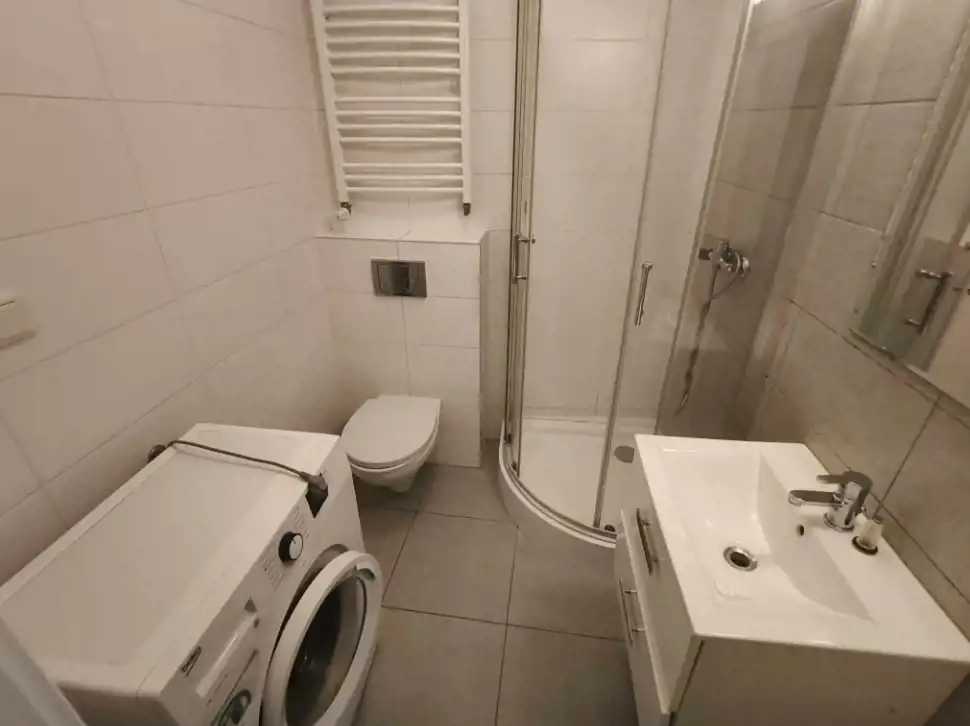 Wyposażona w kabinę prysznicową, WC oraz pralkę.