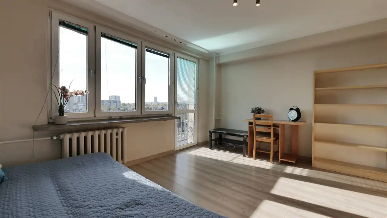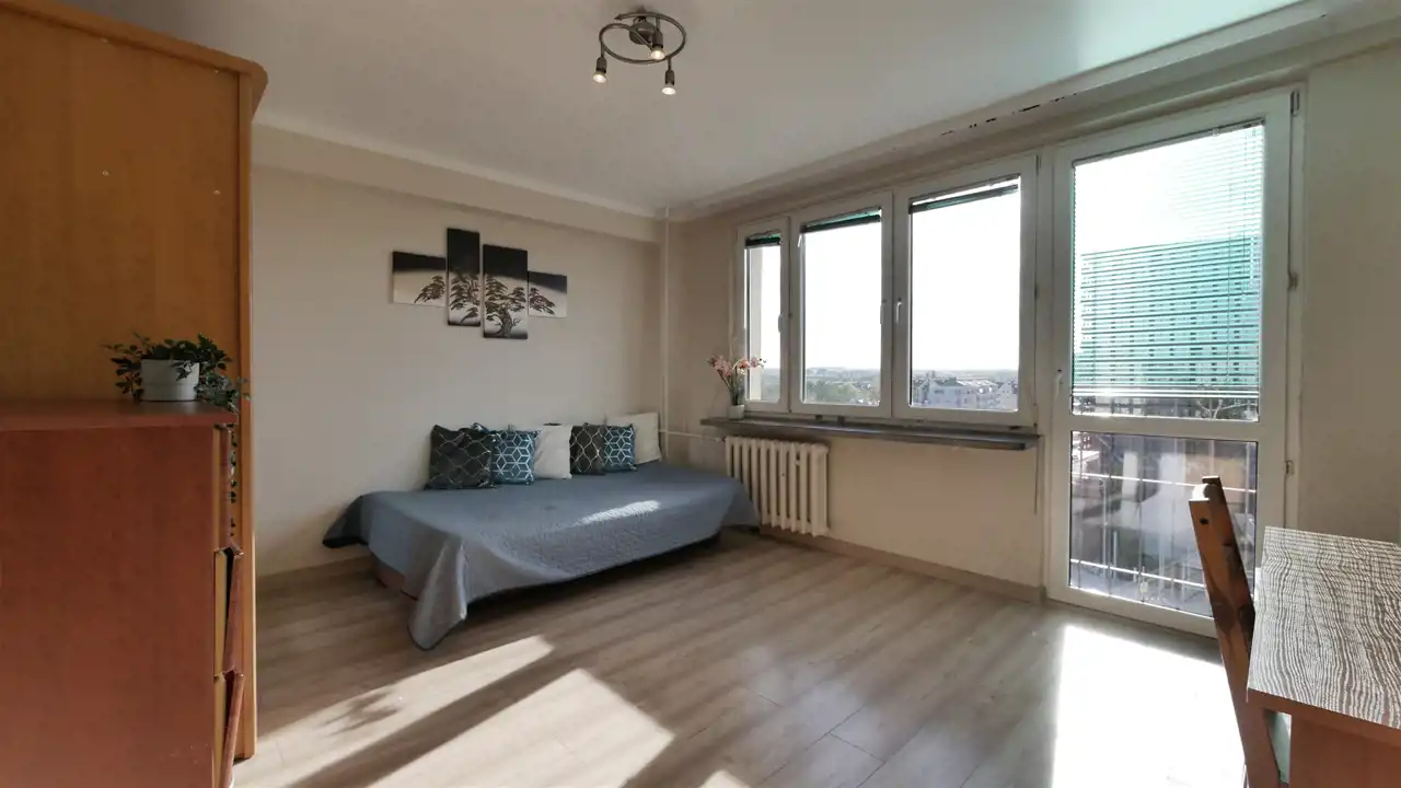 Do wynajęcia mieszkanie jednopokojowe o powierzchni 22 mkw. Nieruchomość znajduje się na siódmym piętrze w budynku ośmiokondygnacyjnym. Mieszkanie składa się z pokoju z wyjściem na balkon, aneksu kuchennego (dodano nowe szafki) z wejściem z przedpokoju oraz łazienki. W kuchni znajduje się kilka półek oraz kuchenka gazowa. Pokój dzienny jest dobrze oświetlony, na południowo-wschodnią stronę. Łazienka wyposażona w kabinę prysznicową, umywalkę, toaletę i pralkę.