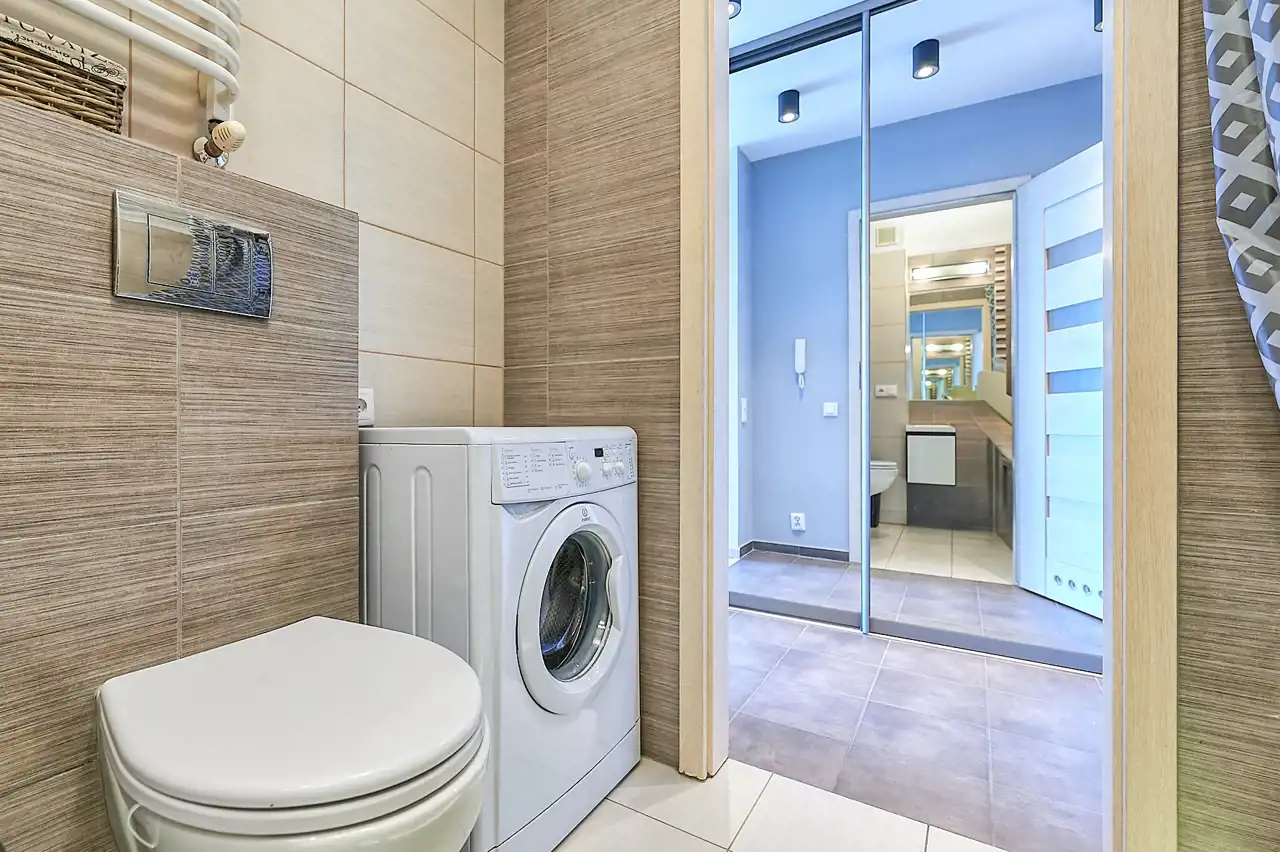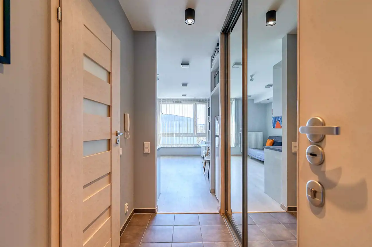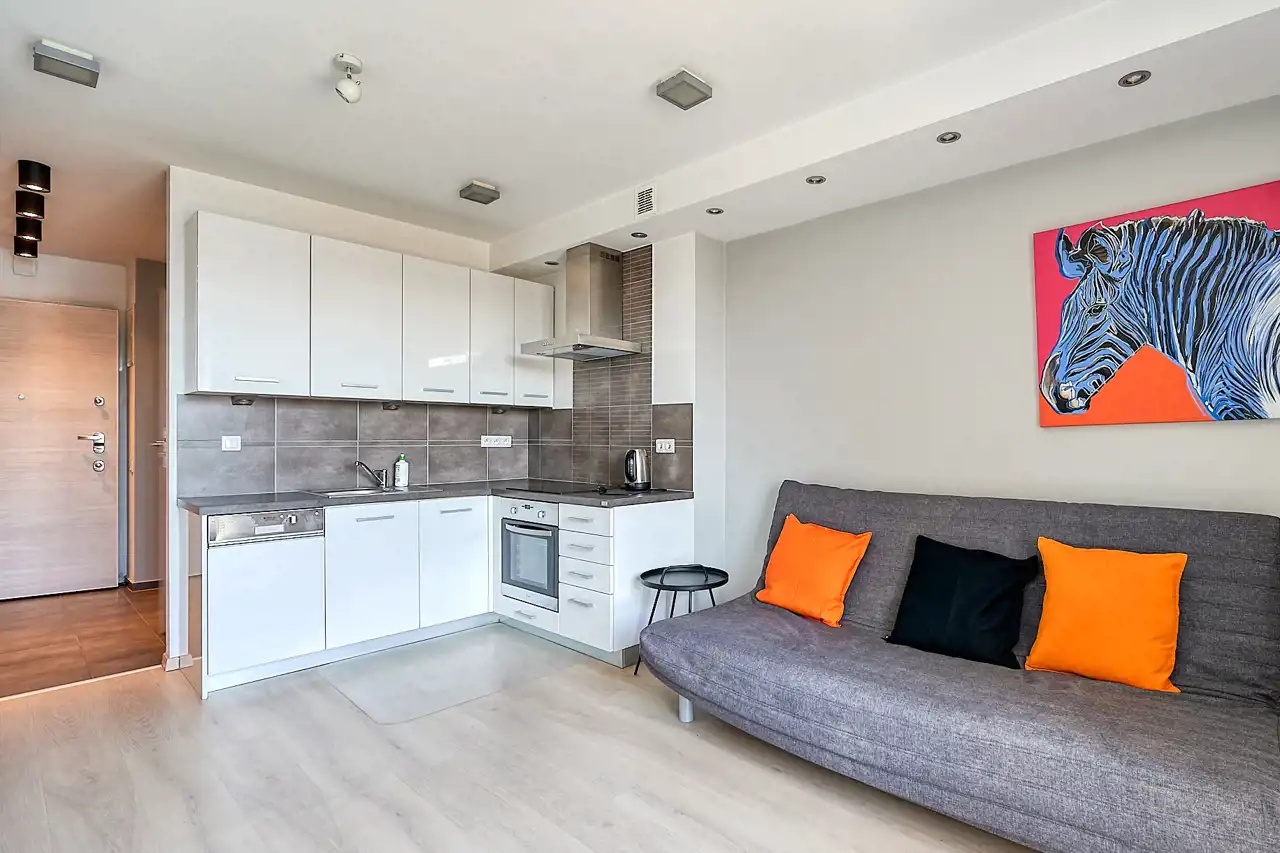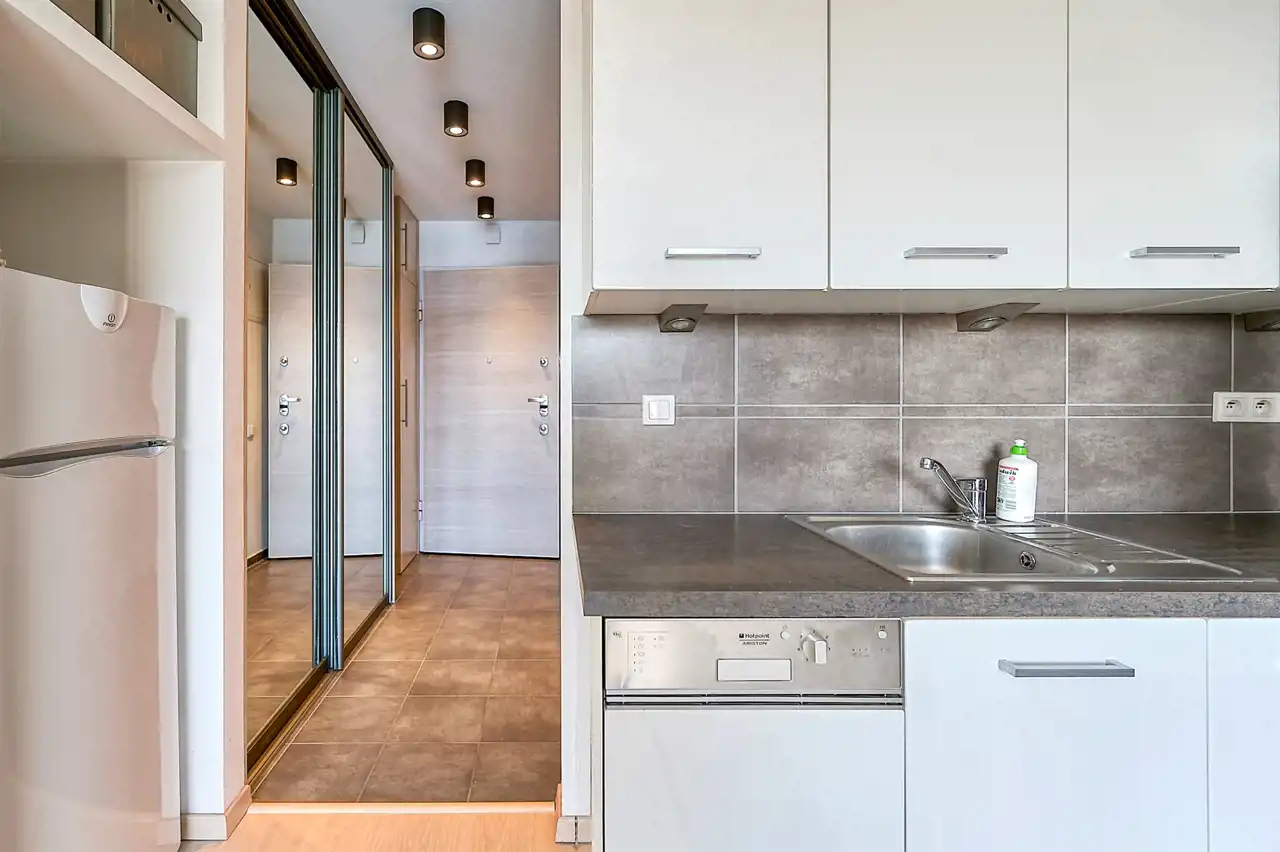 Mieszkanie składa się z salonu z aneksem kuchennym, przedpokoju oraz łazienki z wanną.Jest całkowicie umeblowane - w przedpokoju pojemne szafy i wyposażone w sprzęt AGD - pralka, zmywarka, piekarnik, lodówka.