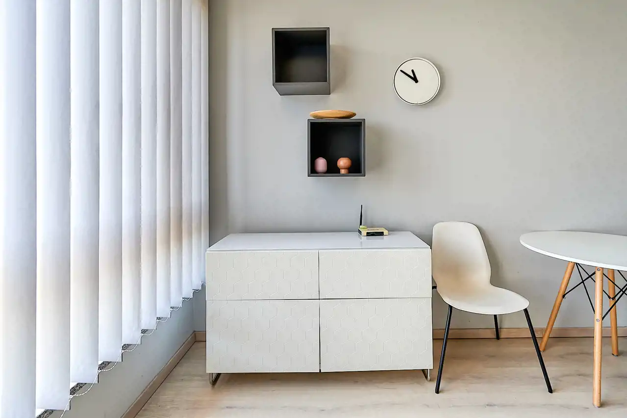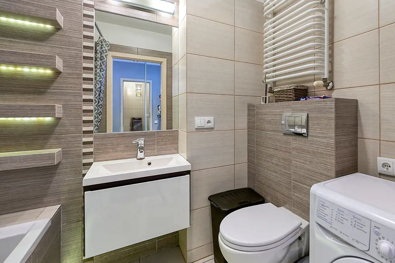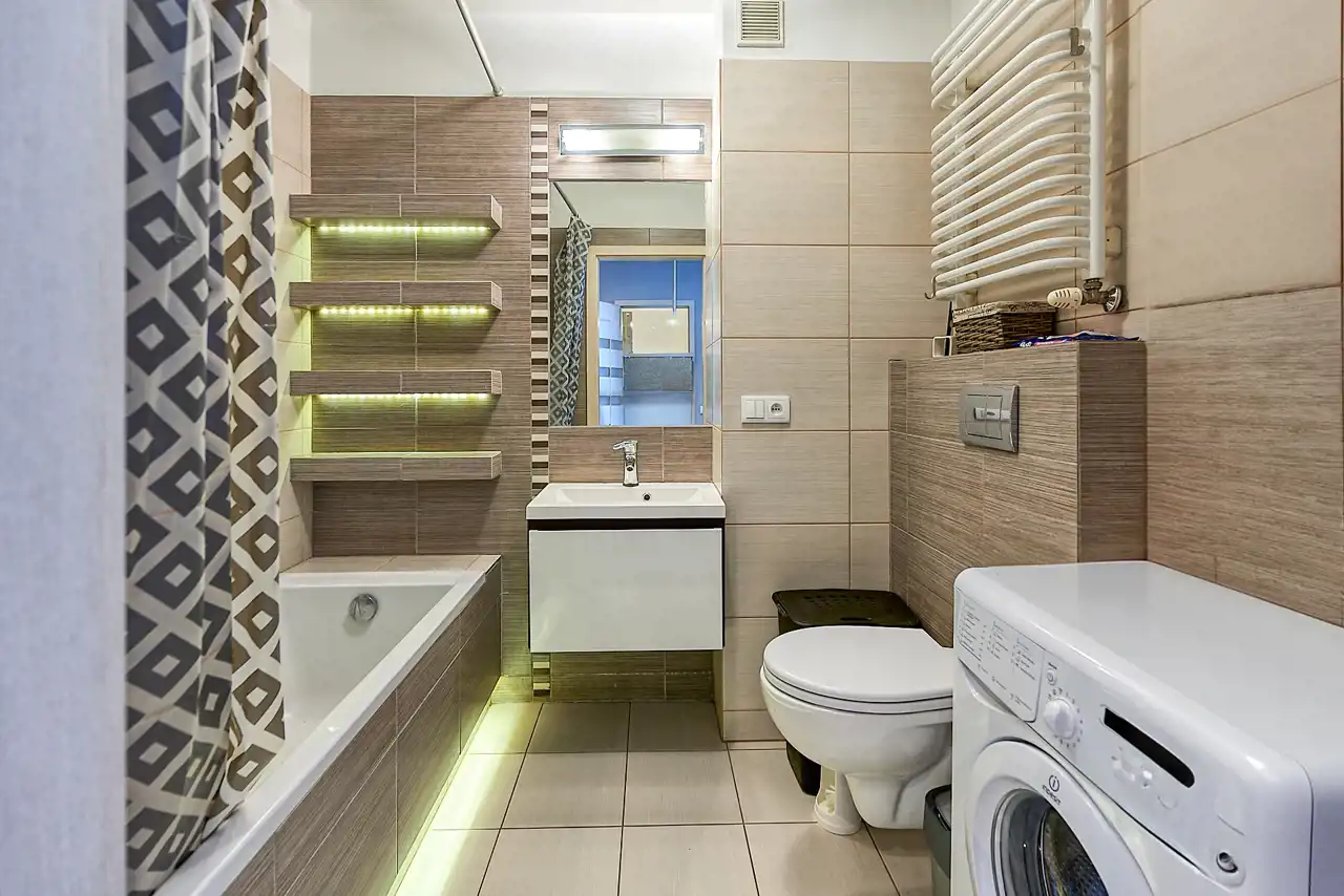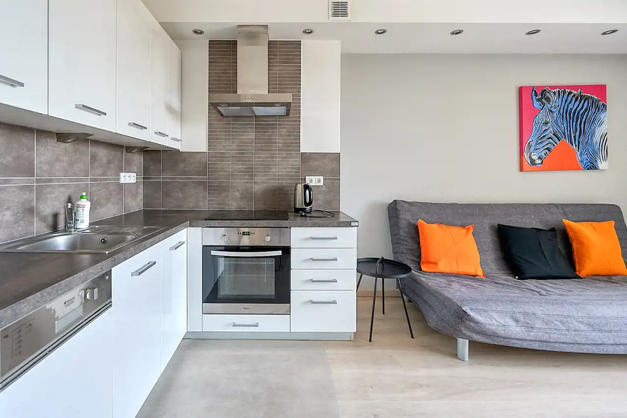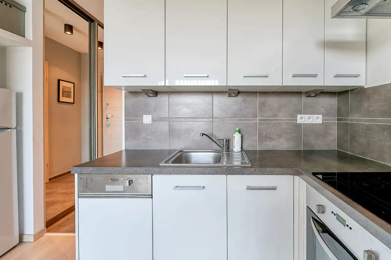 Mieszkanie składa się z salonu z aneksem kuchennym, przedpokoju oraz łazienki z wanną.Jest całkowicie umeblowane - w przedpokoju pojemne szafy i wyposażone w sprzęt AGD - pralka, zmywarka, piekarnik, lodówka.